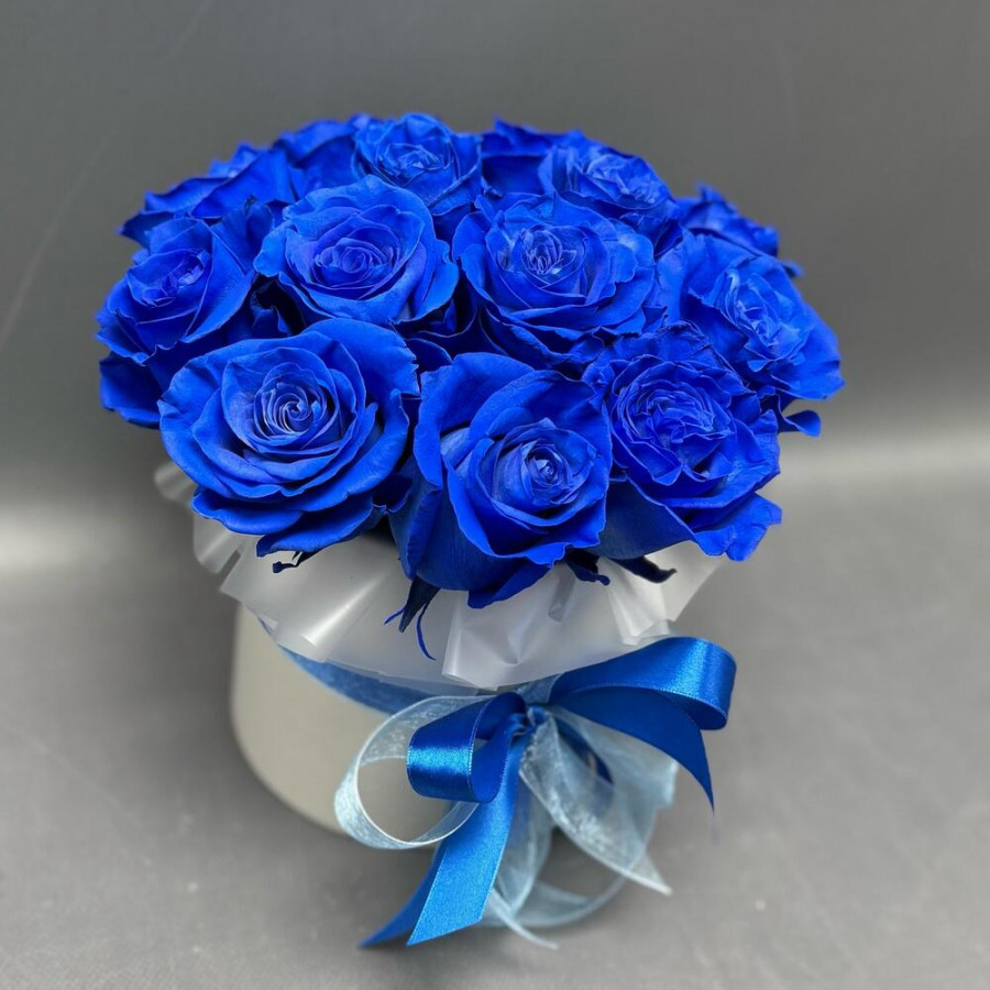На фото 13 синих роз в шляпной коробке. В составе: роза (синяя) 13 шт, оазис флористический 1 шт, шляпная коробка (s) 1 шт, атласная лента 1 шт, . Все цветы свежие и ароматные, букет красиво оформлен и отлично подходит для подарка. Доступна доставка цветов или самовывоз.