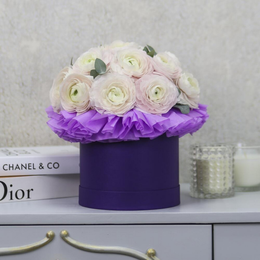 На фото 17 белых ранункулюсов в шляпной коробке. В составе: ранункулюс 17 шт, эвкалипт 2 шт, шляпная коробка (s) 1 шт, . Все цветы свежие и ароматные, букет красиво оформлен и отлично подходит для подарка. Доступна доставка цветов или самовывоз.