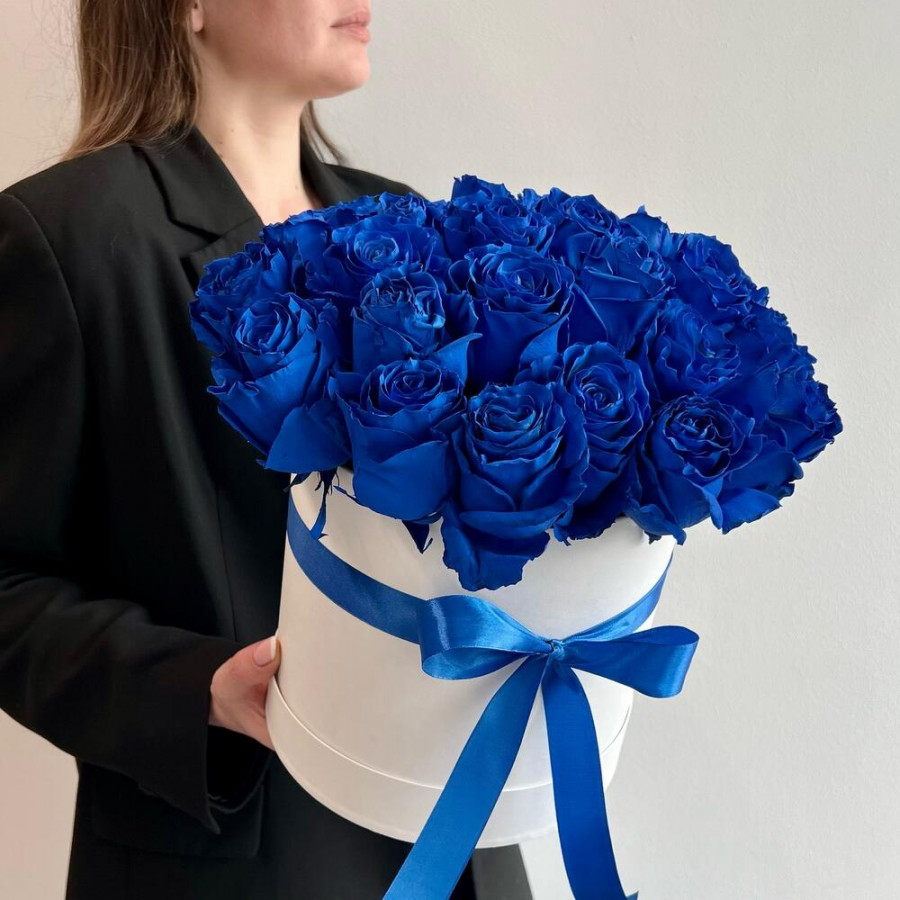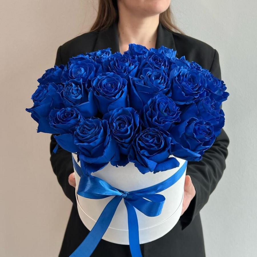 35 синих роз в шляпной коробке
