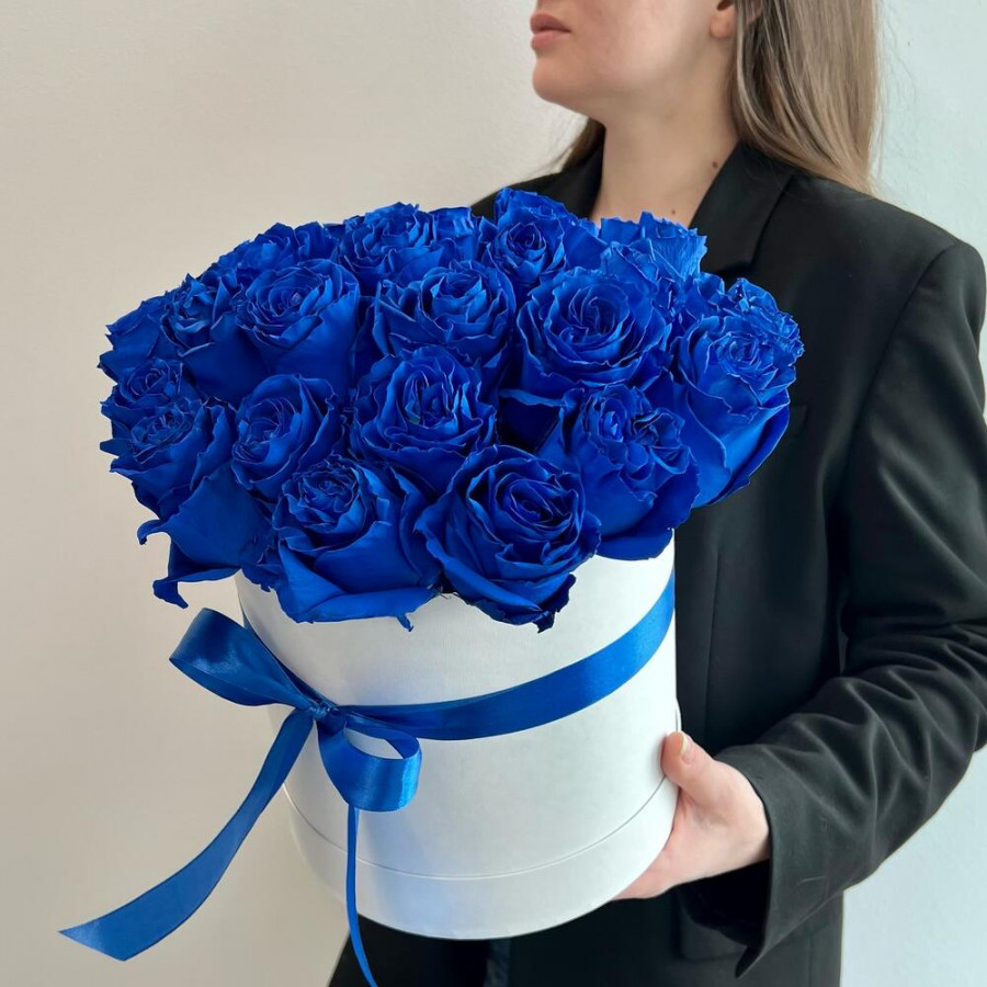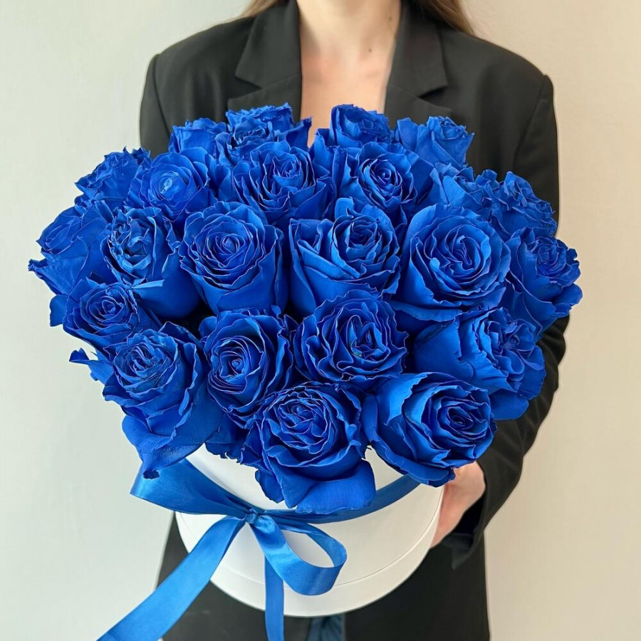На фото 25 синих роз в коробке. В составе: роза (синяя) 25 шт, оазис флористический 2 шт, коробка (m) 1 шт, атласная лента 1 шт, . Все цветы свежие и ароматные, букет красиво оформлен и отлично подходит для подарка. Доступна доставка цветов или самовывоз.