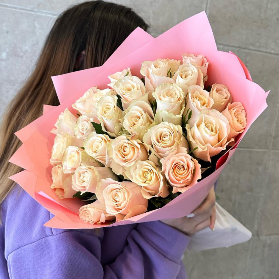 На фото букет из 29 кремовых роз. В составе: роза 29 шт, дизайнерская упаковка 1 шт, атласная лента 1 шт, . Все цветы свежие и ароматные, букет красиво оформлен и отлично подходит для подарка. Доступна доставка цветов или самовывоз.