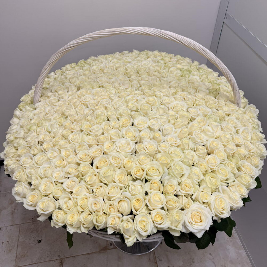 На фото букет из 501 белой розы в корзине «нежность». В составе: роза 501 шт, оазис флористический 7 шт, корзина (xl) 1 шт, . Все цветы свежие и ароматные, букет красиво оформлен и отлично подходит для подарка. Доступна доставка цветов или самовывоз.