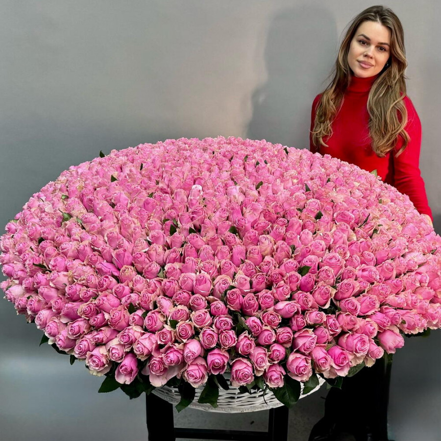 На фото букет из 501 розовой розы «очарование». В составе: роза 501 шт, корзина (xl) 1 шт, оазис флористический 4 шт, . Все цветы свежие и ароматные, букет красиво оформлен и отлично подходит для подарка. Доступна доставка цветов или самовывоз.