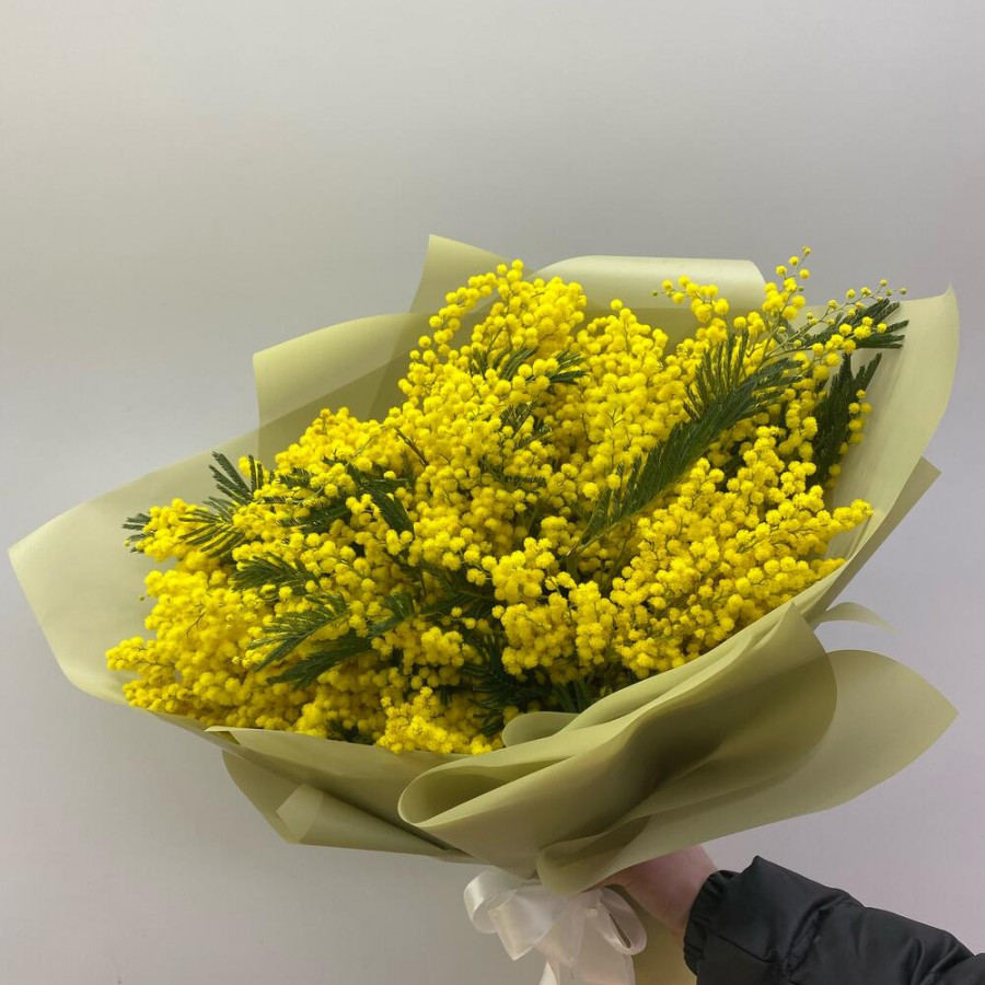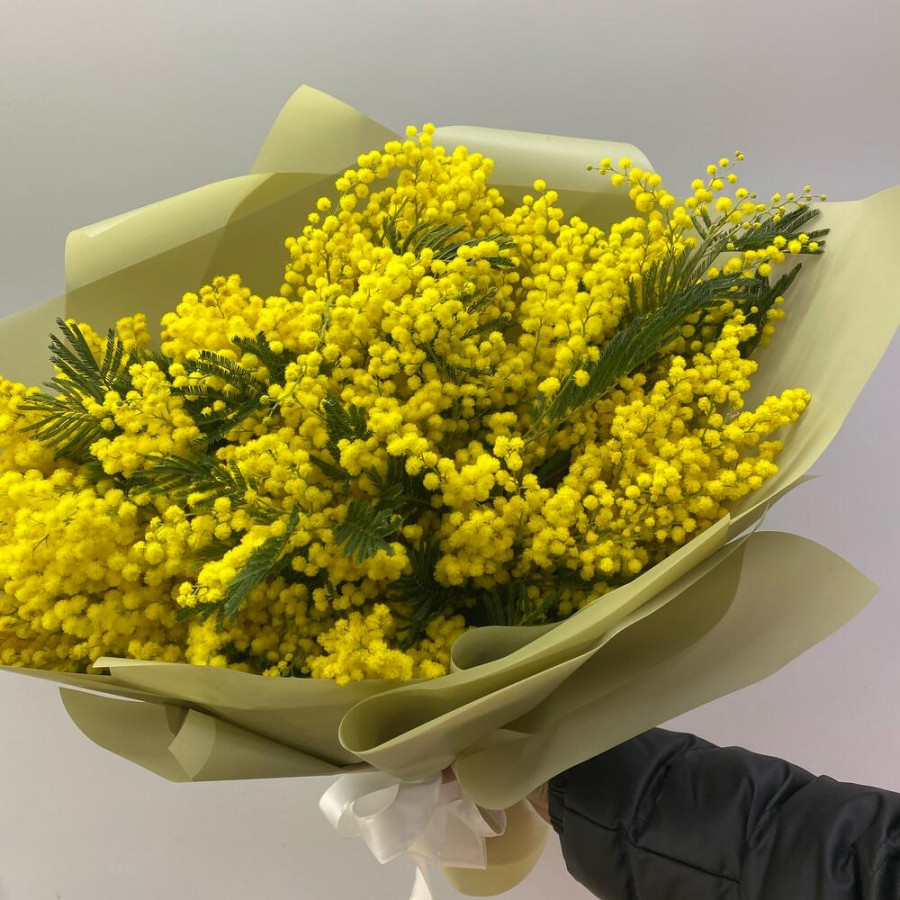 На фото большой букет из мимозы. В составе: мимоза 29 шт, дизайнерская упаковка 1 шт, атласная лента 1 шт, . Все цветы свежие и ароматные, букет красиво оформлен и отлично подходит для подарка. Доступна доставка цветов или самовывоз.