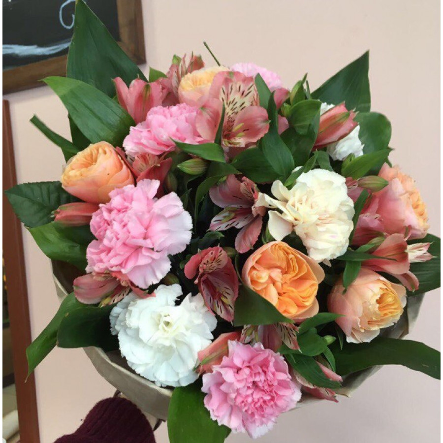 Персиковые пионовидные розы в сочетании с пышными гвоздиками белого и розового цвета - это пышный оригинальный букет, сочные краски которого ярко осветят пасмурный день и принесут в жизнь получательницы теплые тона и терпкие ароматы. Искрящиеся вточки альстромерии вносят в букет яркие нотки радости, и у Вас не должно остаться сомнений, что такой букет станет причиной улыбаться и быть счастливой.