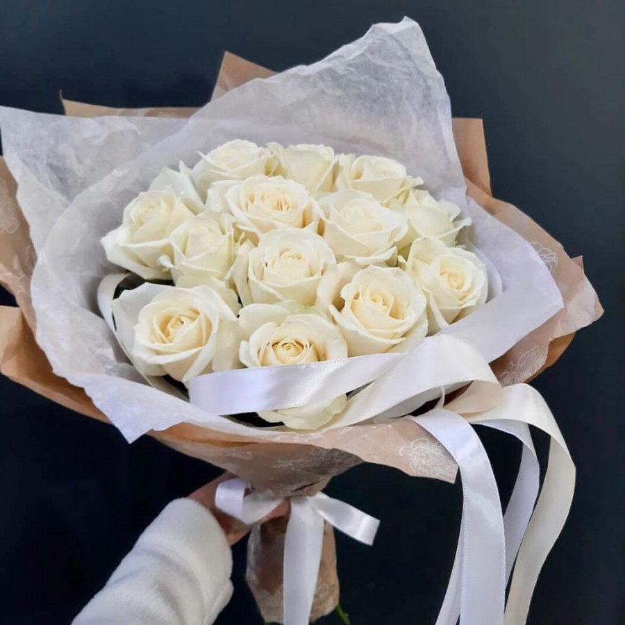 На фото букет из 13 белых роз. В составе: роза 13 шт, крафт-бумага 1 шт, . Все цветы свежие и ароматные, букет красиво оформлен и отлично подходит для подарка. Доступна доставка цветов или самовывоз.