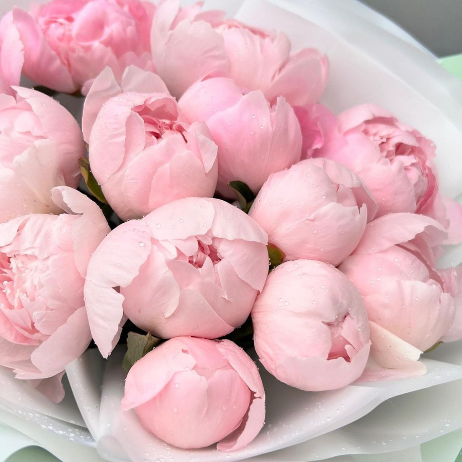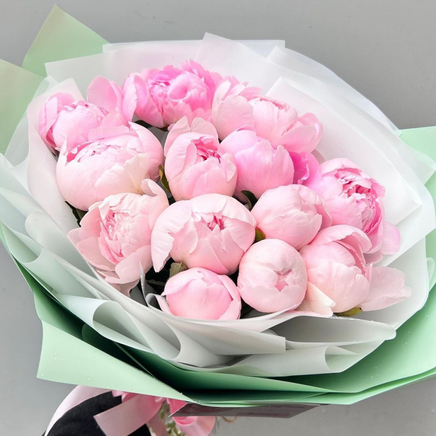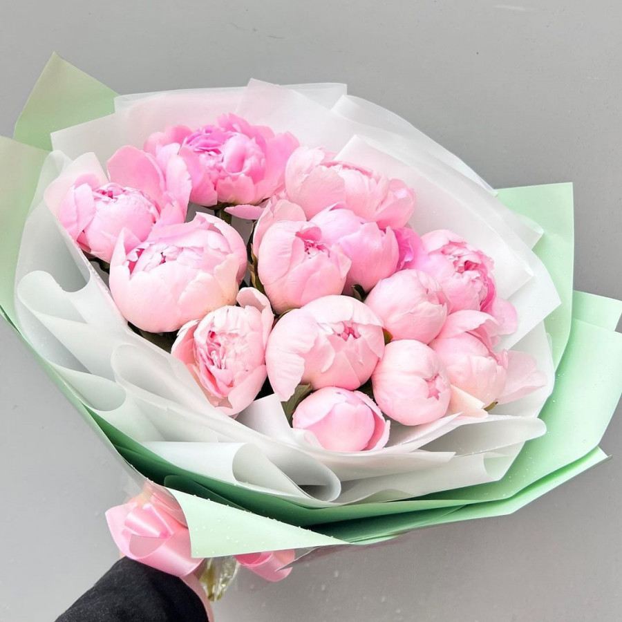 На фото букет из 13 розовых пионов. В составе: пион 13 шт, фоамиран 1 шт, атласная лента 1 шт, . Все цветы свежие и ароматные, букет красиво оформлен и отлично подходит для подарка. Доступна доставка цветов или самовывоз.