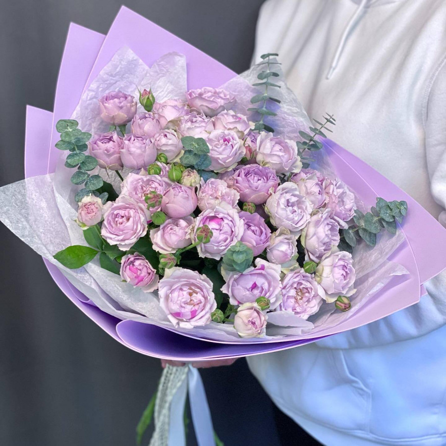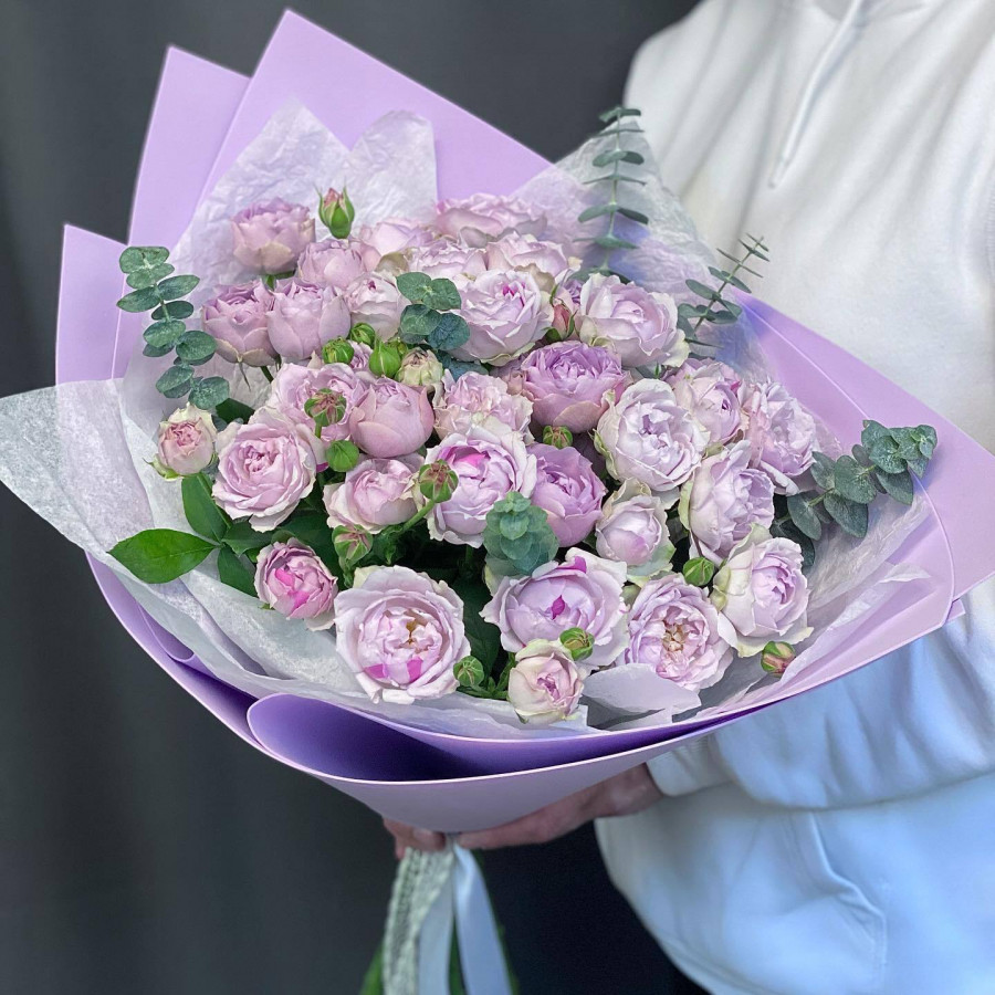 На фото букет из 15 фиолетовых пионовидных роз. В составе: кустовая пионовидная роза 15 шт, эвкалипт 3 шт, крафт-бумага 1 шт, . Все цветы свежие и ароматные, букет красиво оформлен и отлично подходит для подарка. Доступна доставка цветов или самовывоз.