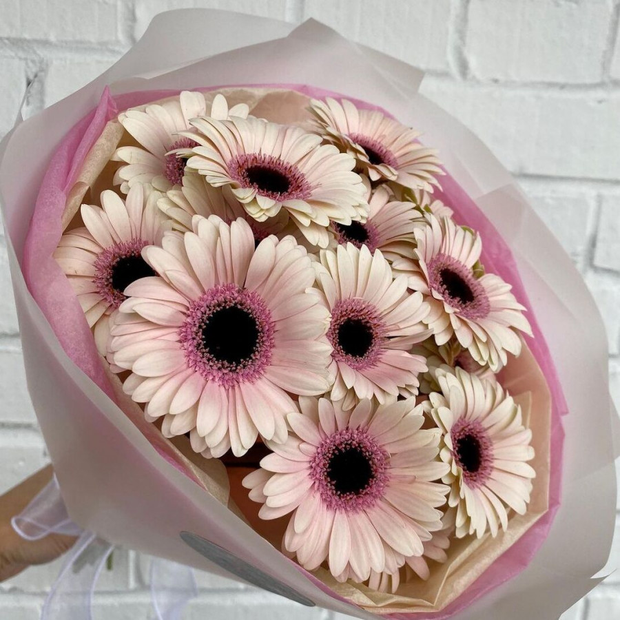 На фото букет из 15 розовых гербер. В составе: гербера 15 шт, крафт-бумага 1 шт, атласная лента 1 шт, . Все цветы свежие и ароматные, букет красиво оформлен и отлично подходит для подарка. Доступна доставка цветов или самовывоз.