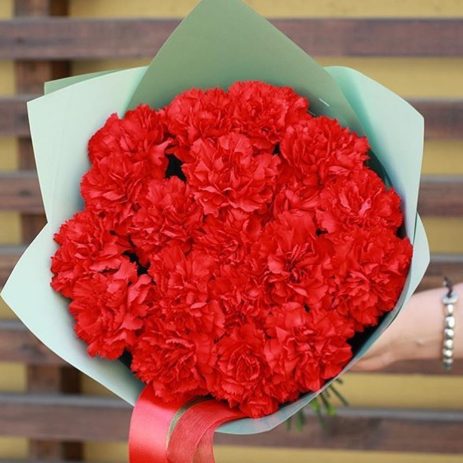 На фото букет из 19 красных гвоздик. В составе: гвоздика 19 шт, крафт-бумага 1 шт, атласная лента 1 шт, . Все цветы свежие и ароматные, букет красиво оформлен и отлично подходит для подарка. Доступна доставка цветов или самовывоз.