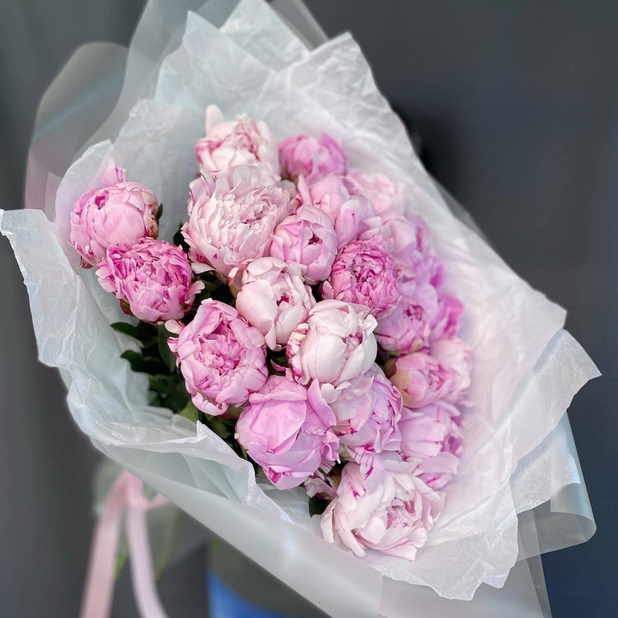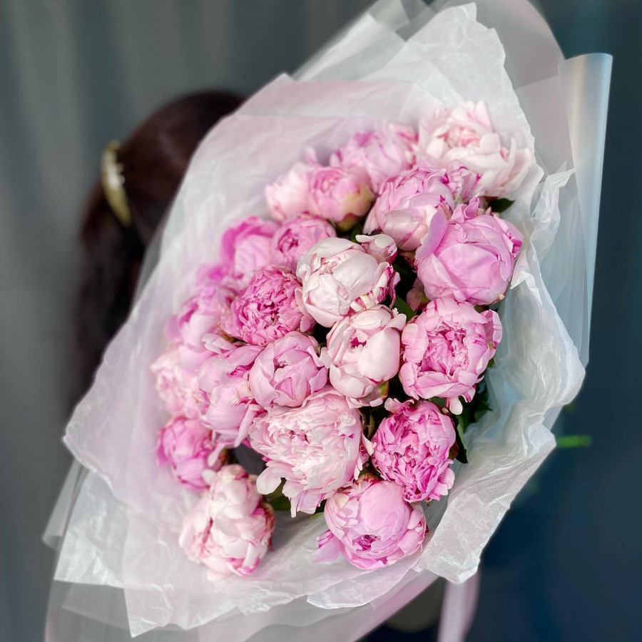 На фото букет из 21 розового пиона. В составе: пион 21 шт, крафт-бумага 1 шт, . Все цветы свежие и ароматные, букет красиво оформлен и отлично подходит для подарка. Доступна доставка цветов или самовывоз.