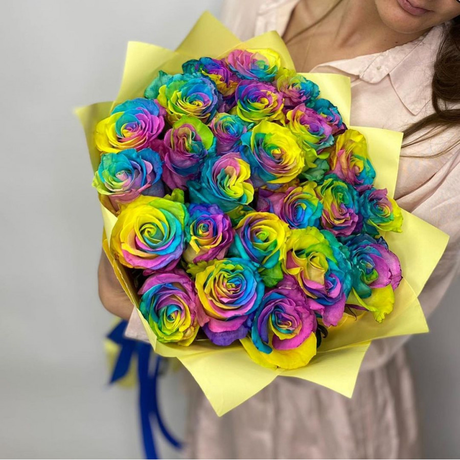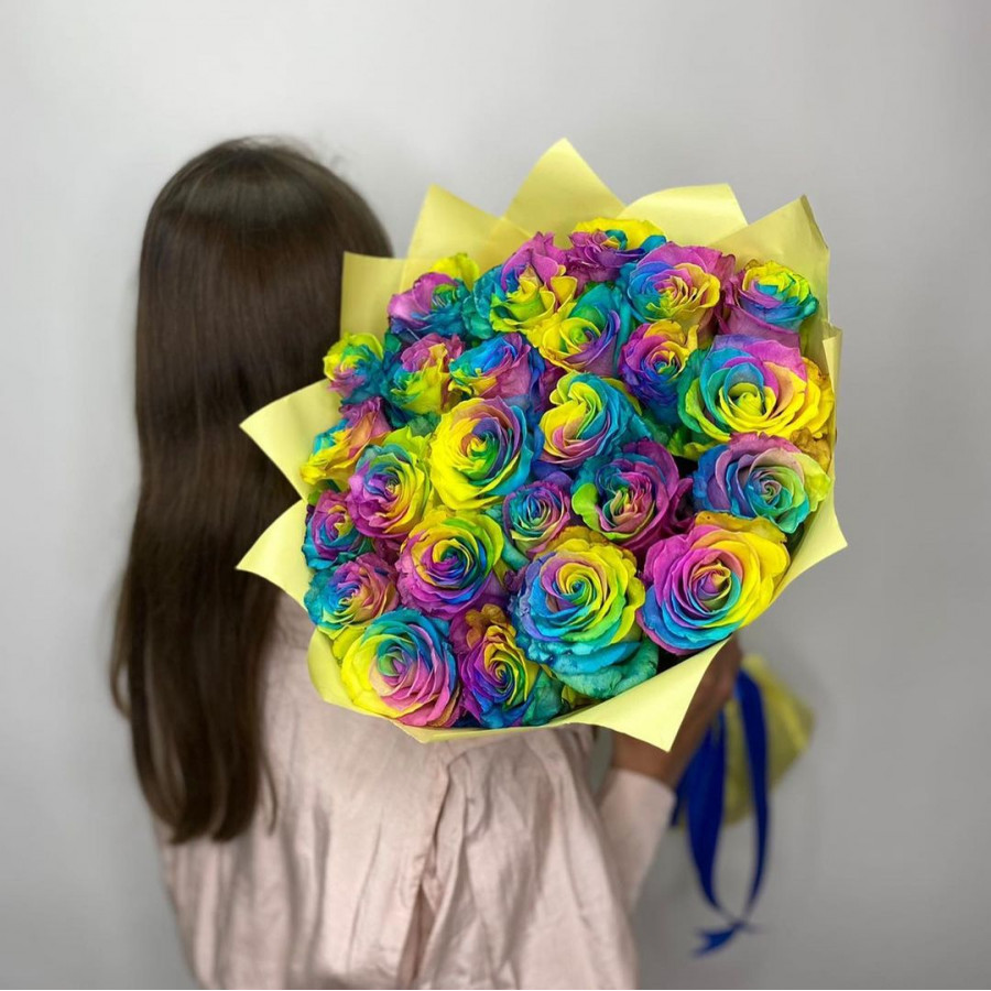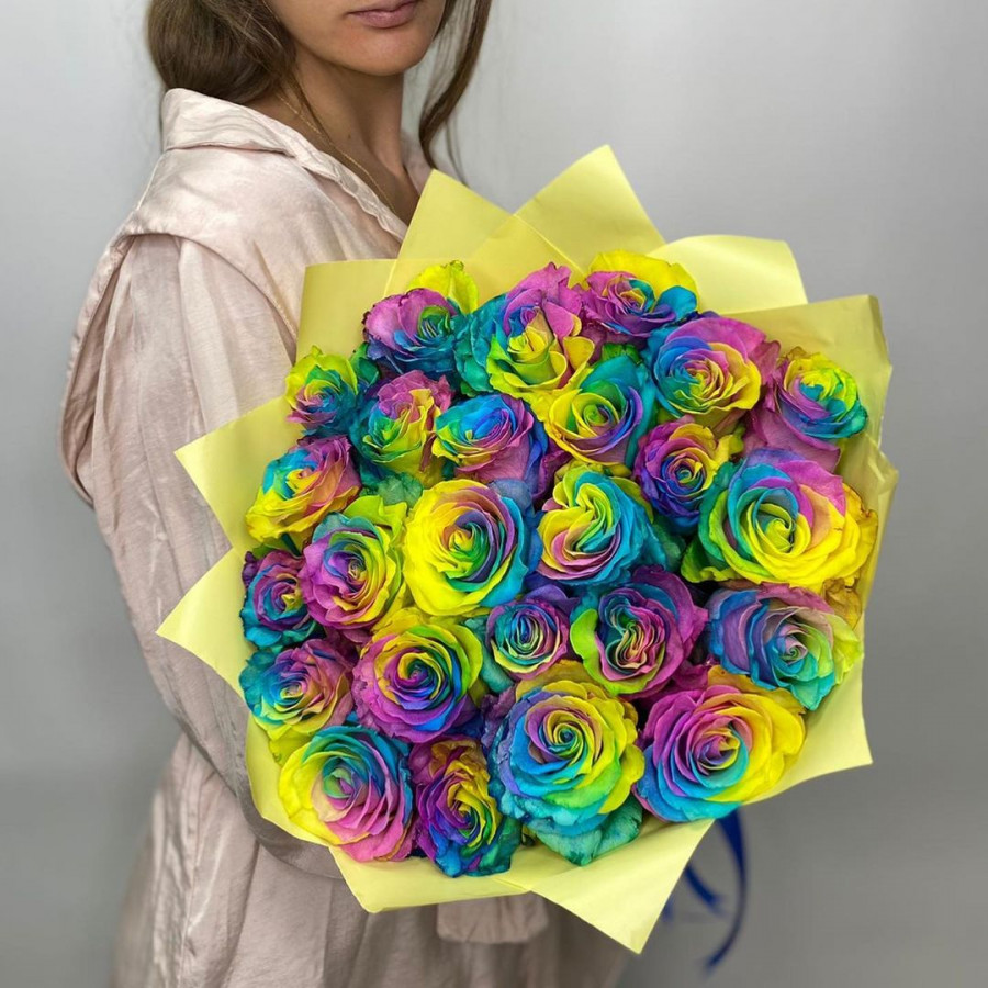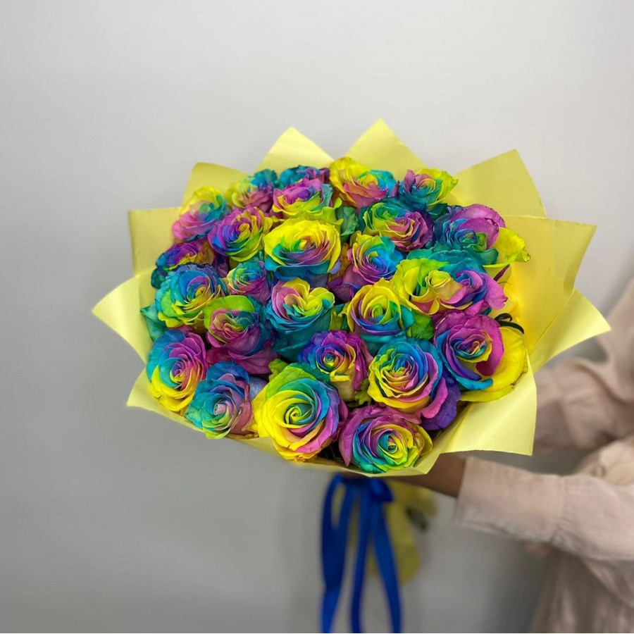 На фото букет из 25 радужных роз. В составе: роза 25 шт, крафт-бумага 1 шт, атласная лента 1 шт, . Все цветы свежие и ароматные, букет красиво оформлен и отлично подходит для подарка. Доступна доставка цветов или самовывоз.