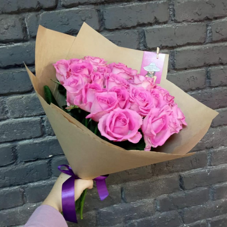 На фото букет из 25 розовых кенийский роз. В составе: роза (кения) 25 шт, крафт-бумага 1 шт, атласная лента 1 шт, . Все цветы свежие и ароматные, букет красиво оформлен и отлично подходит для подарка. Доступна доставка цветов или самовывоз.