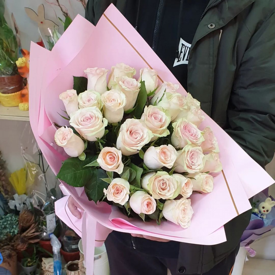 На фото букет из 27 розовых роз. В составе: роза 27 шт, крафт-бумага 1 шт, атласная лента 1 шт, . Все цветы свежие и ароматные, букет красиво оформлен и отлично подходит для подарка. Доступна доставка цветов или самовывоз.