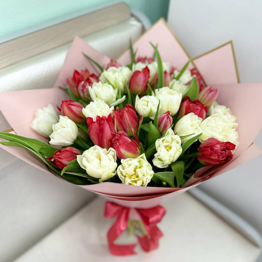 На фото букет из 31 белого и красного тюльпана. В составе: тюльпан 31 шт, крафт-бумага 1 шт, атласная лента 1 шт, . Все цветы свежие и ароматные, букет красиво оформлен и отлично подходит для подарка. Доступна доставка цветов или самовывоз.