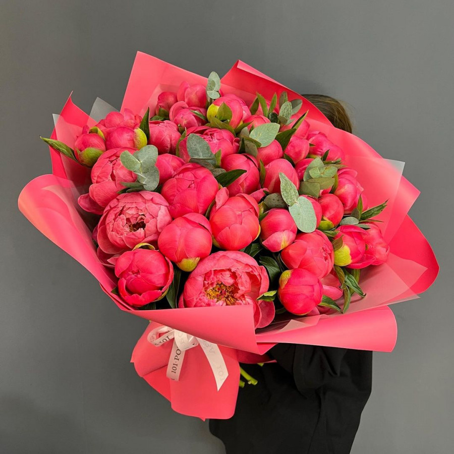 На фото букет из 35 коралловых пионов. В составе: пион 35 шт, крафт-бумага 1 шт, атласная лента 1 шт, . Все цветы свежие и ароматные, букет красиво оформлен и отлично подходит для подарка. Доступна доставка цветов или самовывоз.
