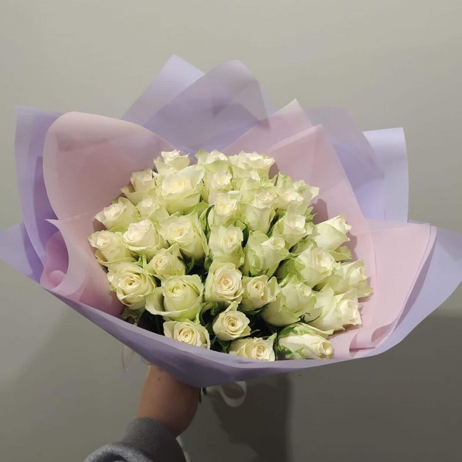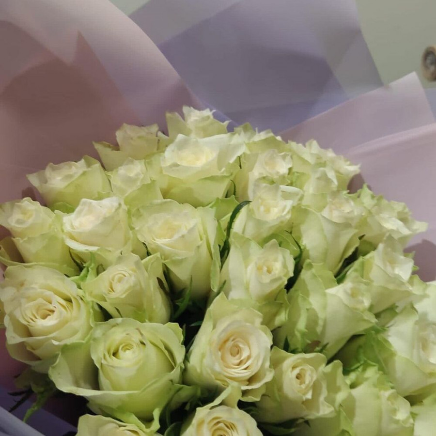 На фото букет из 37 белых роз. В составе: роза 37 шт, крафт-бумага 1 шт, атласная лента 1 шт, . Все цветы свежие и ароматные, букет красиво оформлен и отлично подходит для подарка. Доступна доставка цветов или самовывоз.