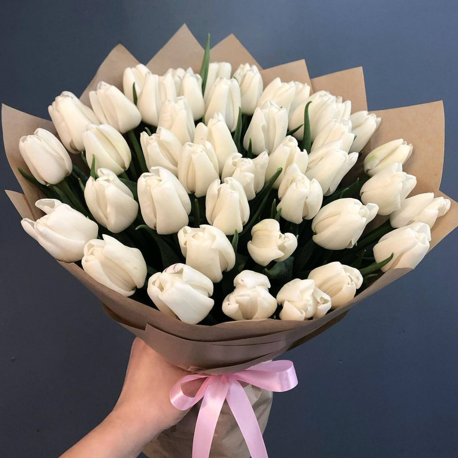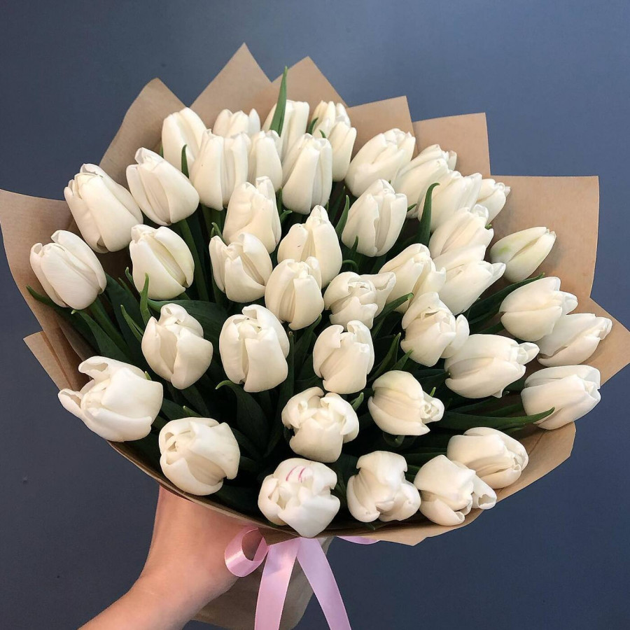 На фото букет из 49 белых тюльпанов. В составе: тюльпан 49 шт, крафт-бумага 1 шт, . Все цветы свежие и ароматные, букет красиво оформлен и отлично подходит для подарка. Доступна доставка цветов или самовывоз.