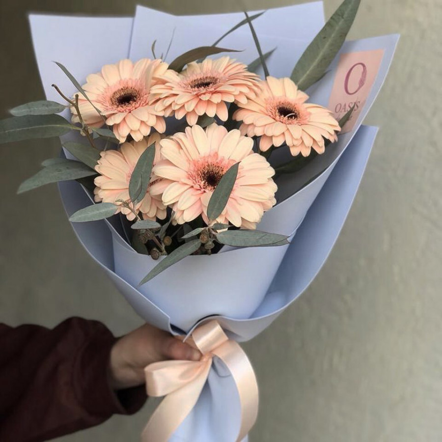 На фото букет из 5 кремовых гербер. В составе: гербера 5 шт, эвкалипт 2 шт, крафт-бумага 1 шт, атласная лента 1 шт, . Все цветы свежие и ароматные, букет красиво оформлен и отлично подходит для подарка. Доступна доставка цветов или самовывоз.