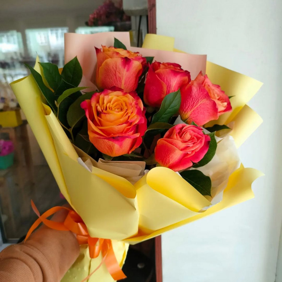 На фото букет из 5 оранжевых роз. В составе: роза 5 шт, крафт-бумага 1 шт, атласная лента 1 шт, . Все цветы свежие и ароматные, букет красиво оформлен и отлично подходит для подарка. Доступна доставка цветов или самовывоз.
