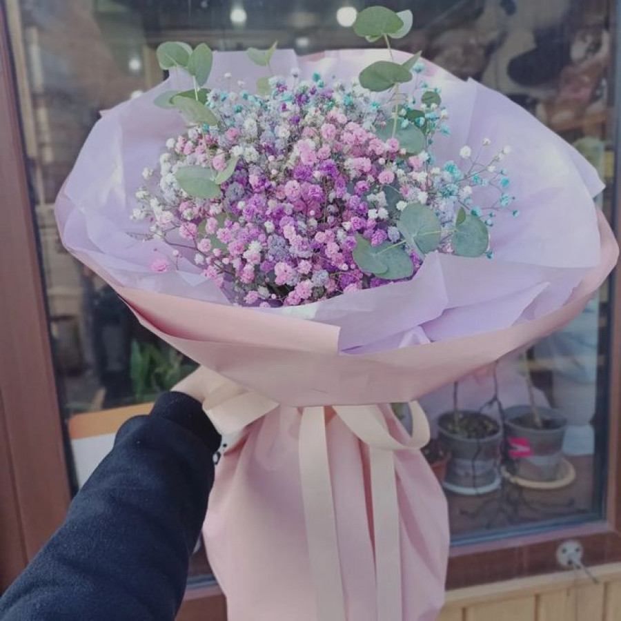 На фото букет из 5 розовых гипсофил. В составе: гипсофила 5 шт, эвкалипт 2 шт, крафт-бумага 1 шт, вибирнум 1 шт, . Все цветы свежие и ароматные, букет красиво оформлен и отлично подходит для подарка. Доступна доставка цветов или самовывоз.