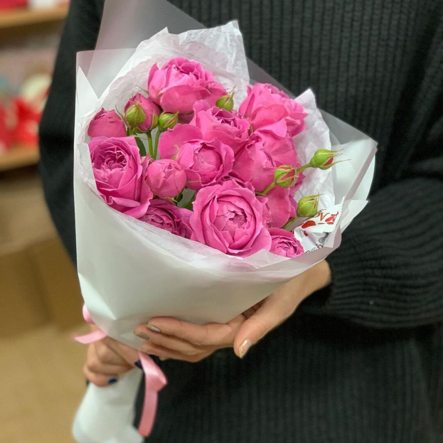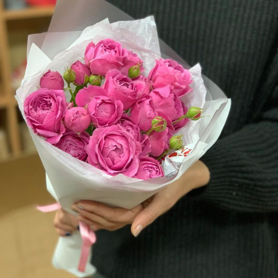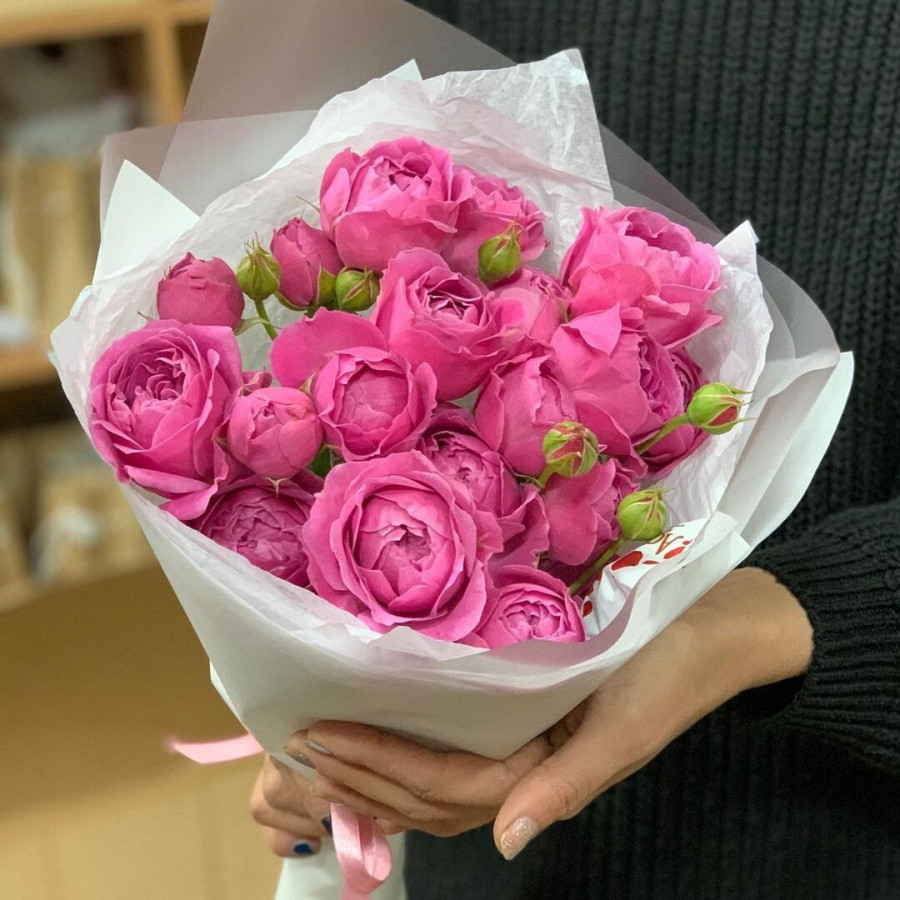 На фото букет из 5 розовых кустовых пионовидных роз. В составе: кустовая пионовидная роза 5 шт, крафт-бумага 1 шт, атласная лента 1 шт, . Все цветы свежие и ароматные, букет красиво оформлен и отлично подходит для подарка. Доступна доставка цветов или самовывоз.
