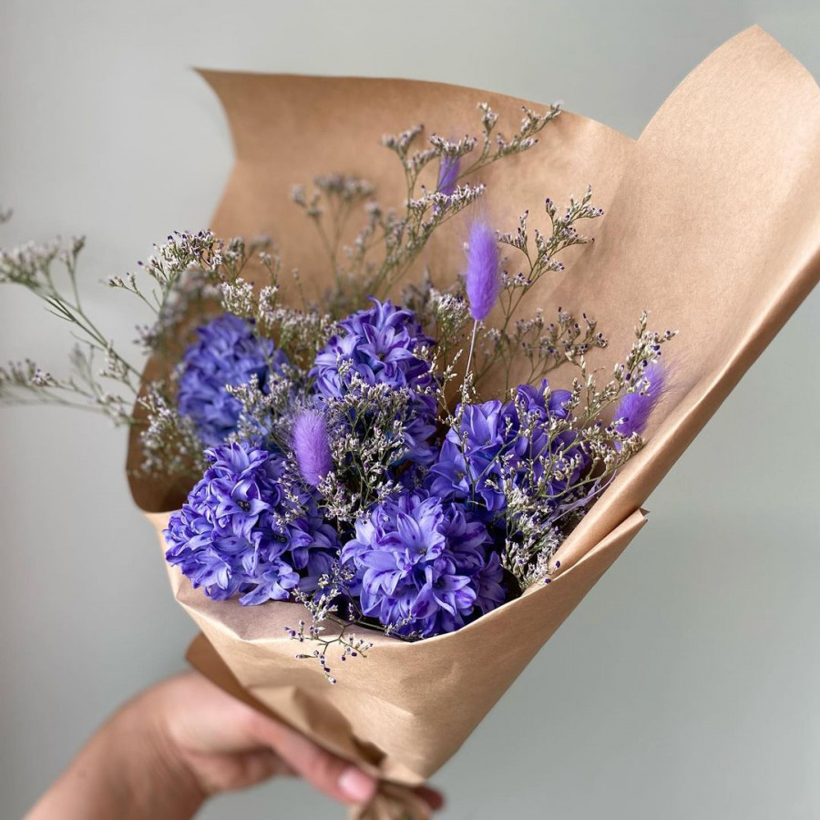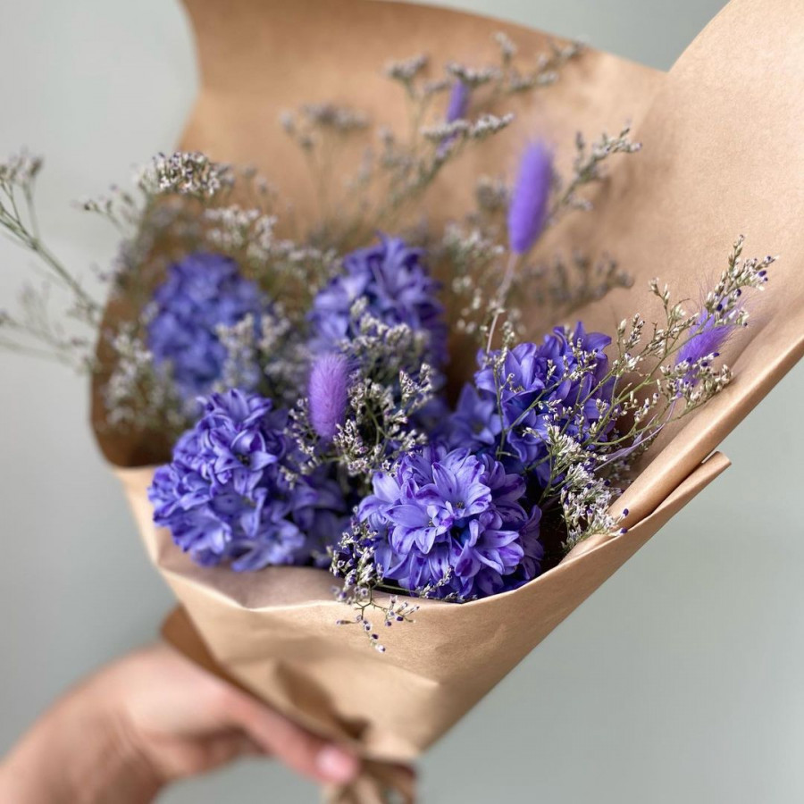 На фото букет из 5 синих гиацинтов. В составе: гиацинт 5 шт, лаванда 2 шт, крафт-бумага 1 шт, атласная лента 1 шт, . Все цветы свежие и ароматные, букет красиво оформлен и отлично подходит для подарка. Доступна доставка цветов или самовывоз.