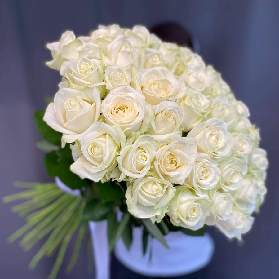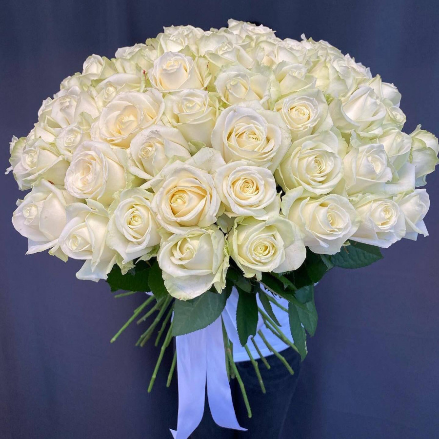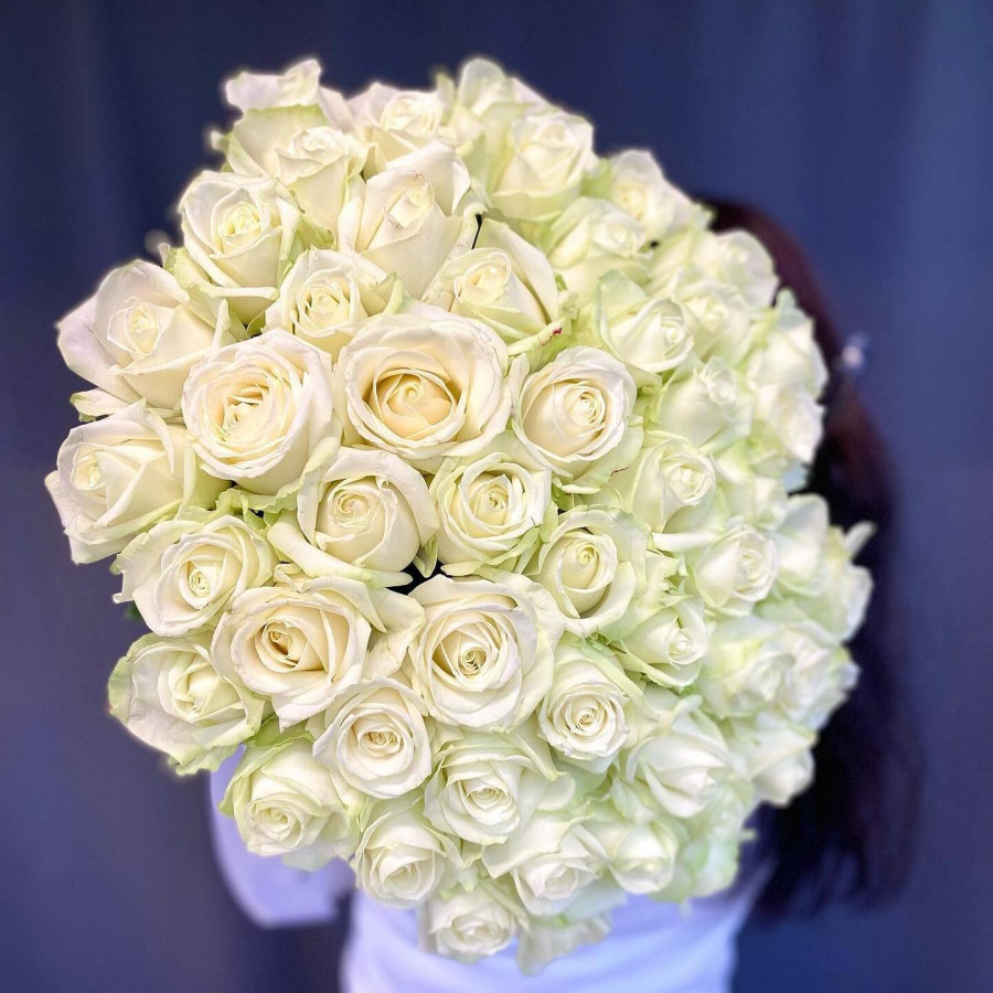 На фото букет из 51 белой розы. В составе: роза 51 шт, . Все цветы свежие и ароматные, букет красиво оформлен и отлично подходит для подарка. Доступна доставка цветов или самовывоз.
