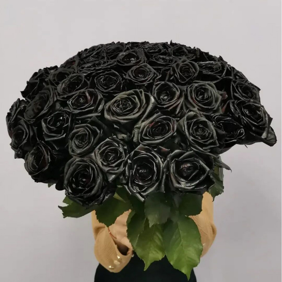 На фото букет из 51 черной розы. В составе: роза 51 шт, крафт-бумага 1 шт, атласная лента 1 шт, . Все цветы свежие и ароматные, букет красиво оформлен и отлично подходит для подарка. Доступна доставка цветов или самовывоз.