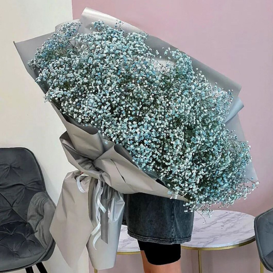 На фото букет из 51 голубой гипсофилы. В составе: гипсофила 51 шт, крафт-бумага 1 шт, атласная лента 1 шт, . Все цветы свежие и ароматные, букет красиво оформлен и отлично подходит для подарка. Доступна доставка цветов или самовывоз.