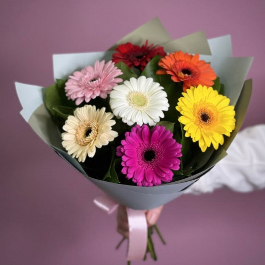 На фото букет из 7 разноцветных гербер. В составе: гербера 7 шт, крафт-бумага 1 шт, атласная лента 1 шт, . Все цветы свежие и ароматные, букет красиво оформлен и отлично подходит для подарка. Доступна доставка цветов или самовывоз.