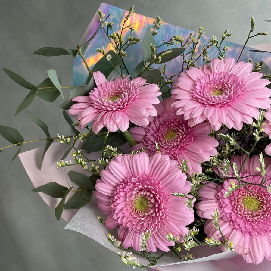 На фото букет из 7 розовых гербер. В составе: гербера 7 шт, эвкалипт 2 шт, крафт-бумага 1 шт, атласная лента 1 шт, . Все цветы свежие и ароматные, букет красиво оформлен и отлично подходит для подарка. Доступна доставка цветов или самовывоз.