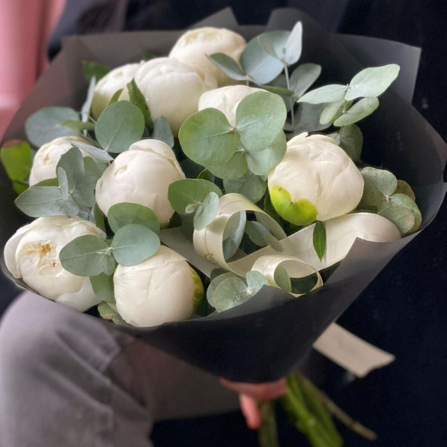 На фото букет из 9 белых пионов. В составе: пион 9 шт, эвкалипт 2 шт, крафт-бумага 1 шт, атласная лента 1 шт, . Все цветы свежие и ароматные, букет красиво оформлен и отлично подходит для подарка. Доступна доставка цветов или самовывоз.