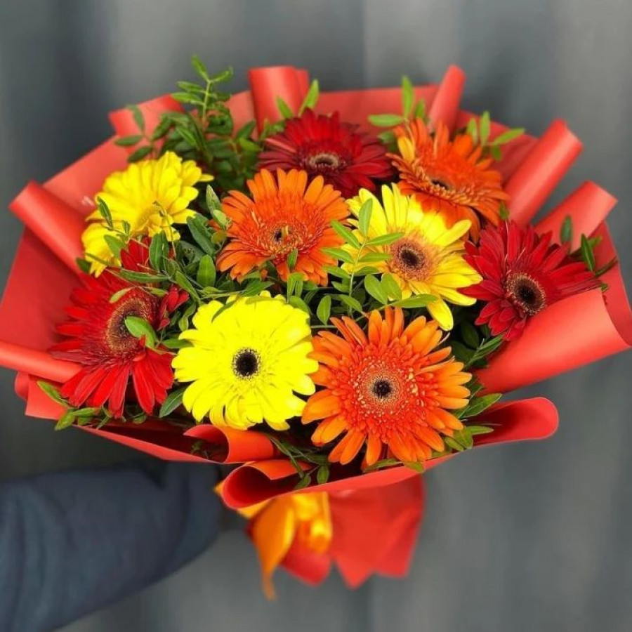 На фото букет из 9 разноцветных гербер. В составе: гербера 9 шт, писташ 2 шт, крафт-бумага 1 шт, атласная лента 1 шт, . Все цветы свежие и ароматные, букет красиво оформлен и отлично подходит для подарка. Доступна доставка цветов или самовывоз.