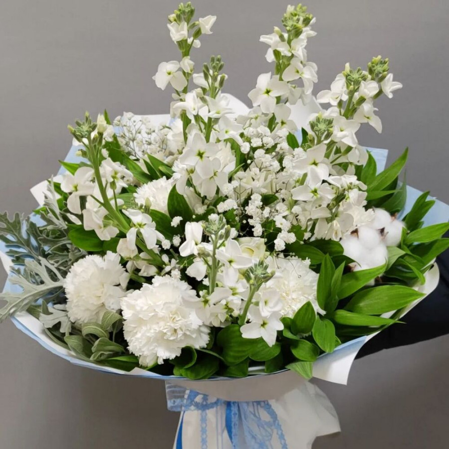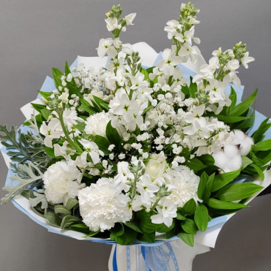 На фото букет из белой маттиолы. В составе: маттиола 5 шт, гвоздика 7 шт, роза 2 шт, крафт-бумага 1 шт, атласная лента 1 шт, . Все цветы свежие и ароматные, букет красиво оформлен и отлично подходит для подарка. Доступна доставка цветов или самовывоз.