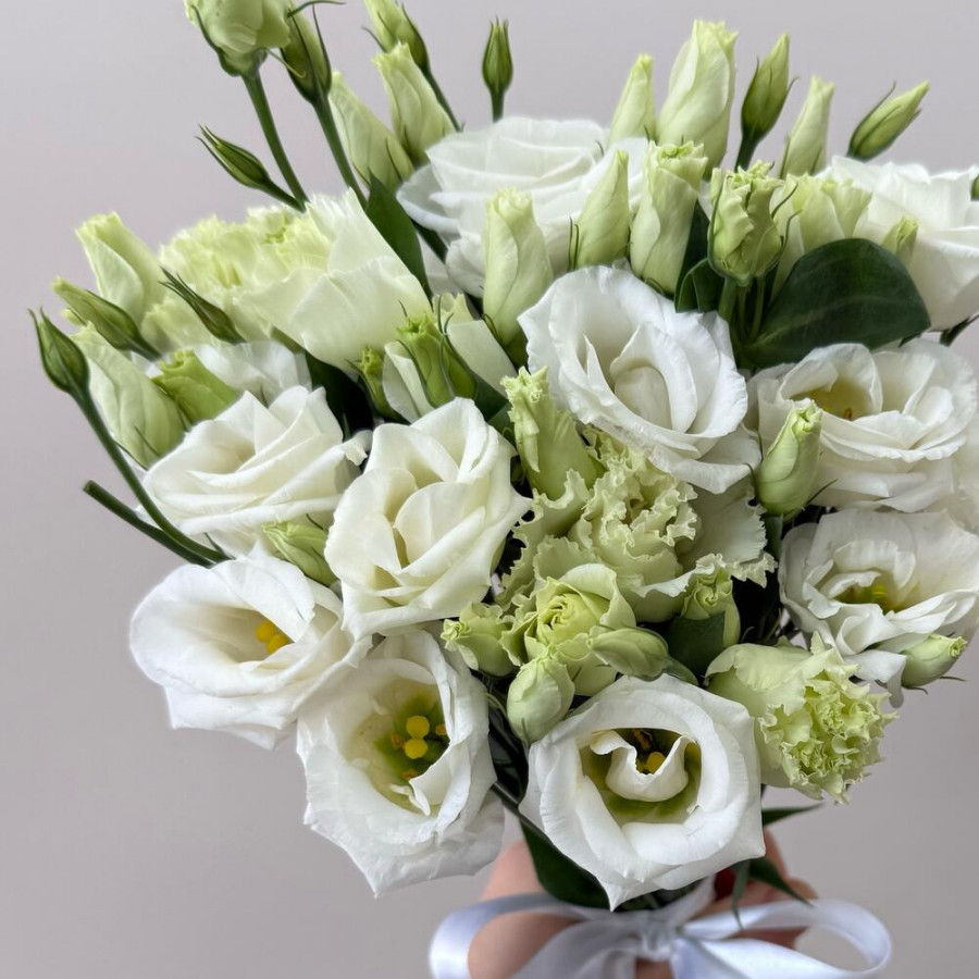 На фото букет из белых эустом для невесты. В составе: эустома (лизиантус) 5 шт, атласная лента 2 шт, . Все цветы свежие и ароматные, букет красиво оформлен и отлично подходит для подарка. Доступна доставка цветов или самовывоз.
