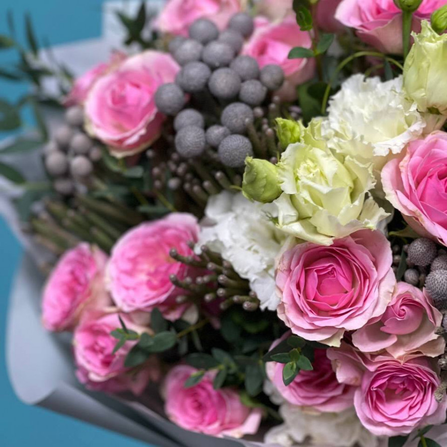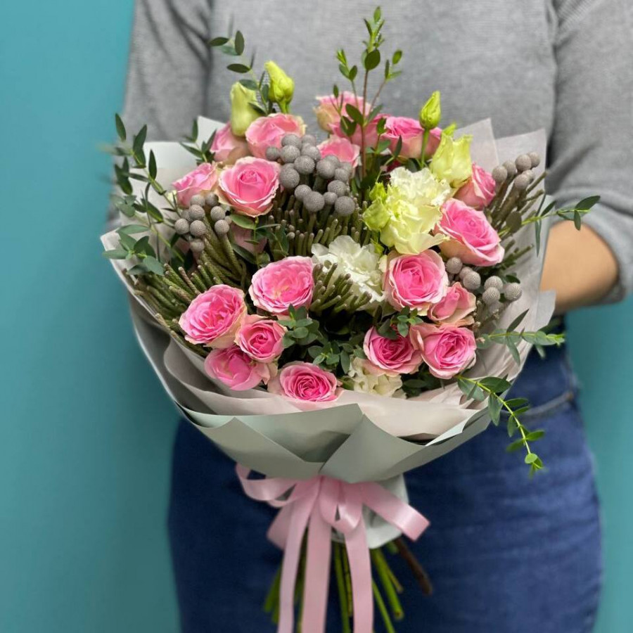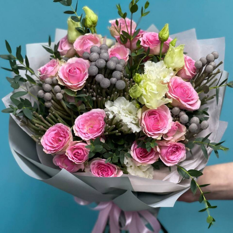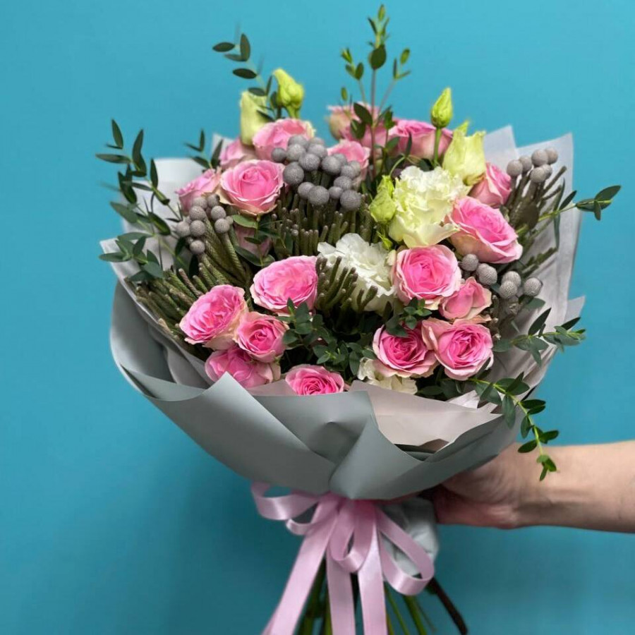 На фото букет из эустомы и розовых кустовых роз. В составе: кустовая роза 5 шт, бруния 4 шт, эустома (лизиантус) 2 шт, эвкалипт 2 шт, крафт-бумага 1 шт, атласная лента 1 шт, . Все цветы свежие и ароматные, букет красиво оформлен и отлично подходит для подарка. Доступна доставка цветов или самовывоз.
