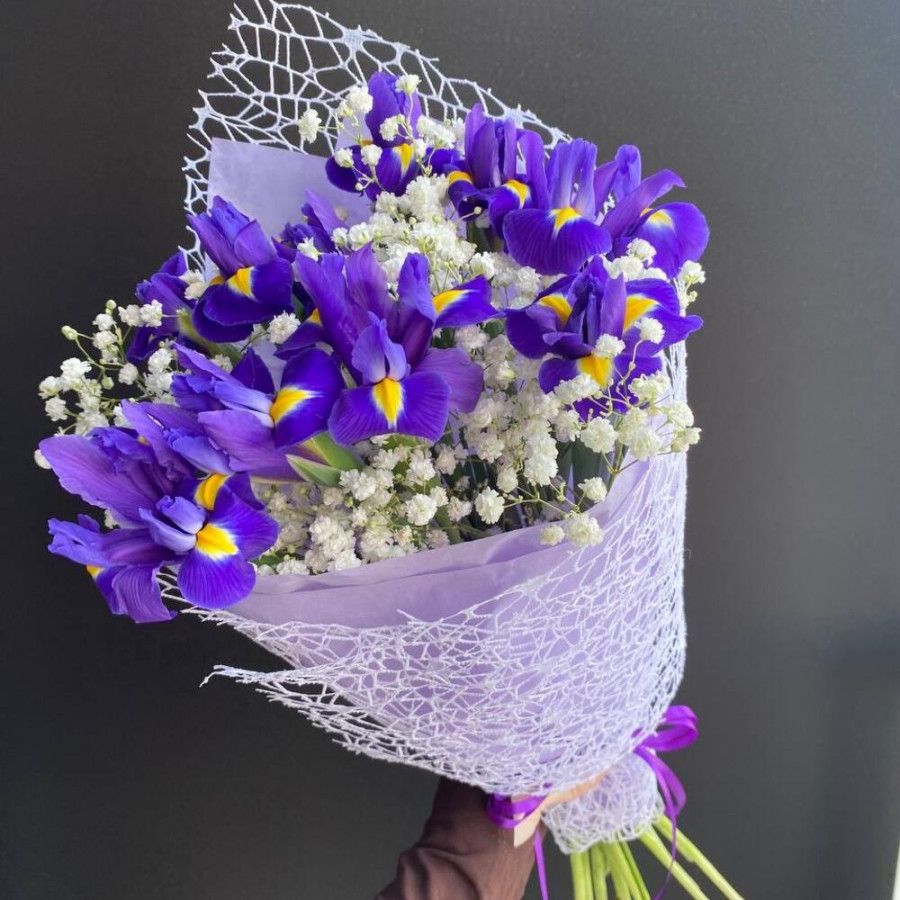 На фото букет из фиолетовых ирисов и белой гипсофилы. В составе: ирис 11 шт, гипсофила 2 шт, дизайнерская упаковка 1 шт, атласная лента 1 шт, . Все цветы свежие и ароматные, букет красиво оформлен и отлично подходит для подарка. Доступна доставка цветов или самовывоз.