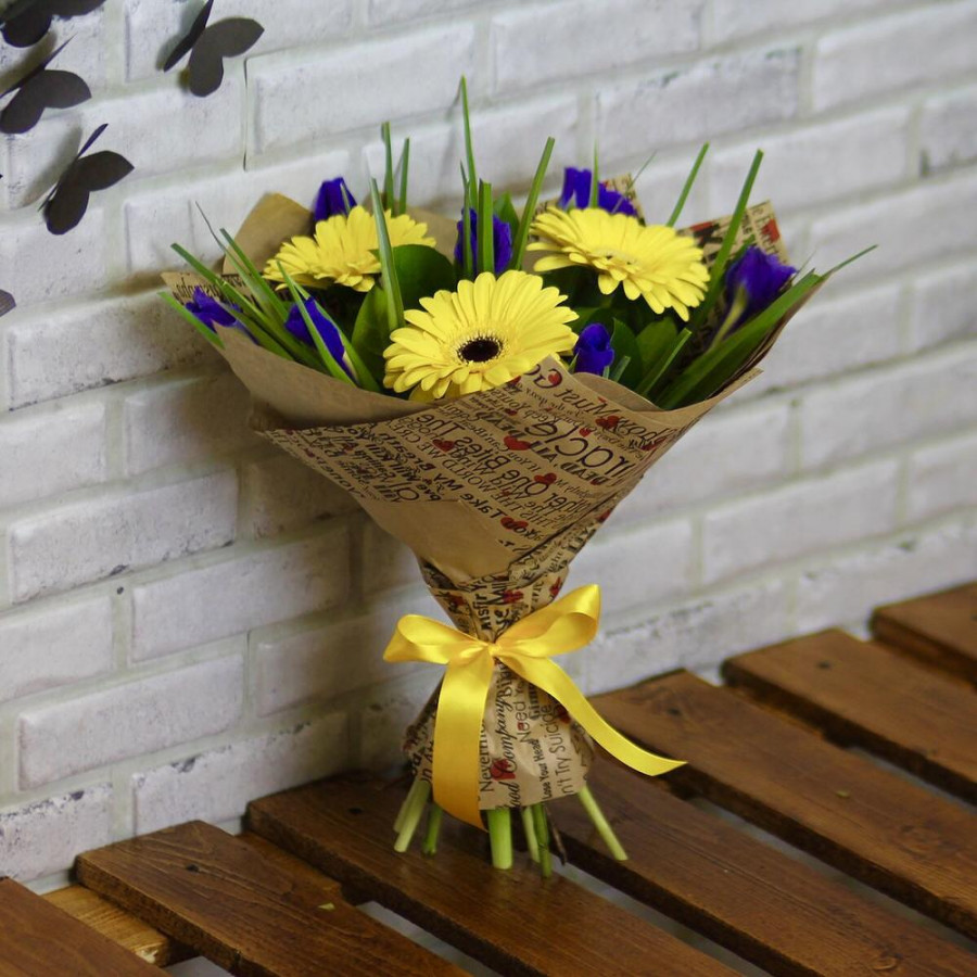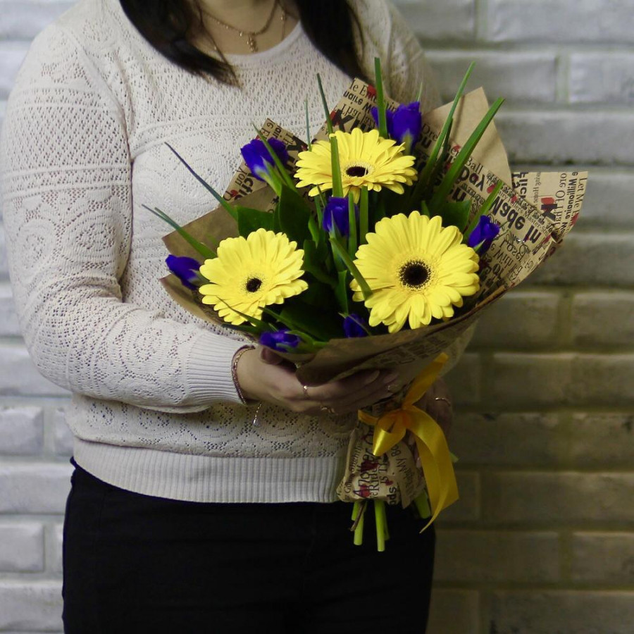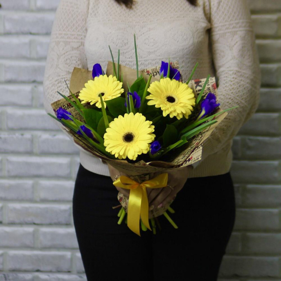 Букет из желтых гербер с синими ирисами в Семикаракорске