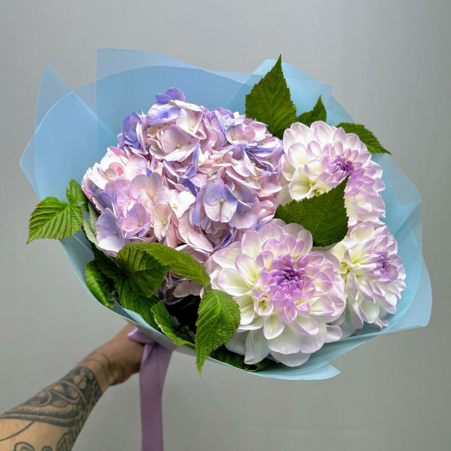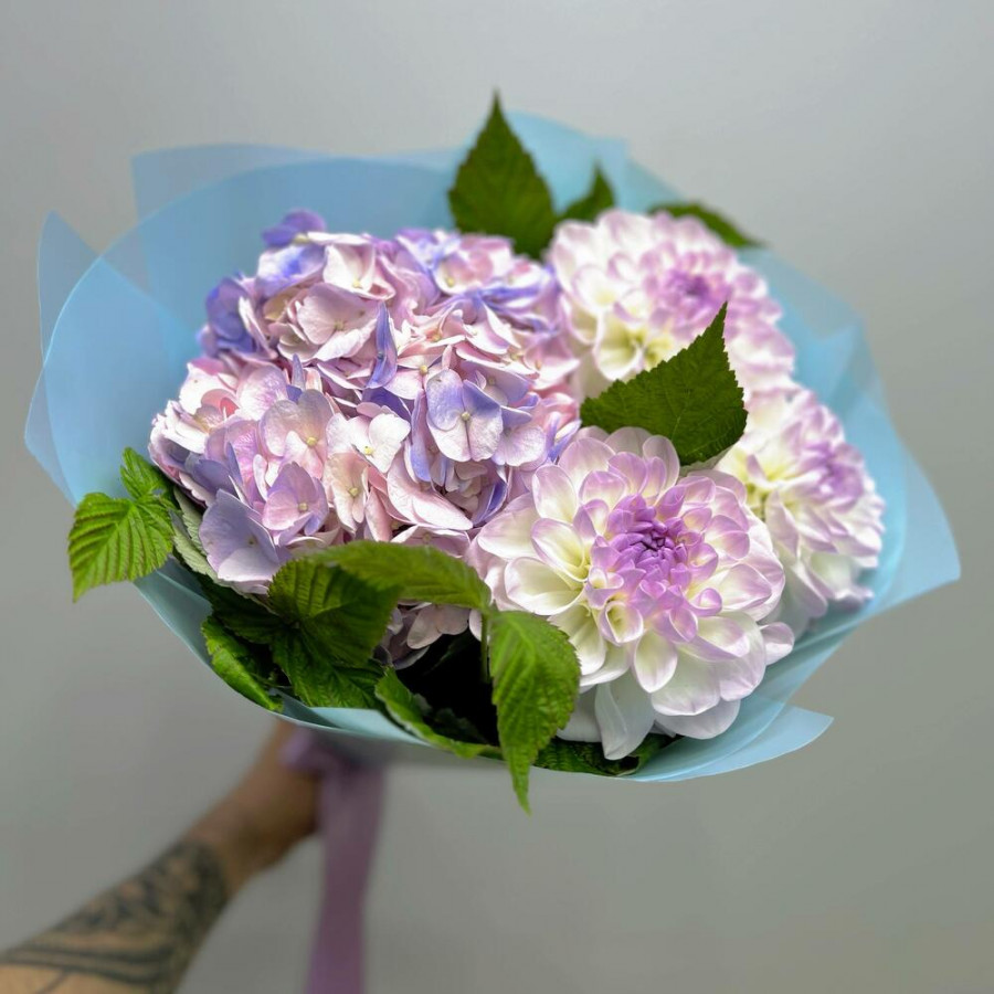 На фото букет из гортензии и георгинов. В составе: георгина 3 шт, гортензия 1 шт, зелень 4 шт, дизайнерская упаковка 1 шт, атласная лента 1 шт, . Все цветы свежие и ароматные, букет красиво оформлен и отлично подходит для подарка. Доступна доставка цветов или самовывоз.