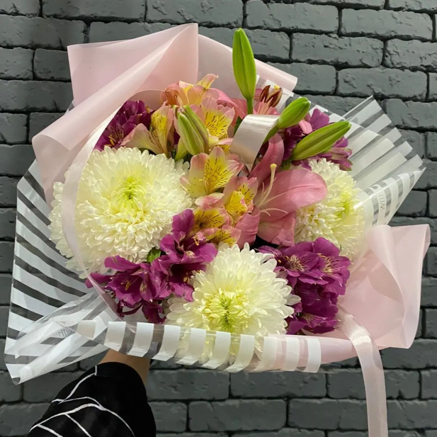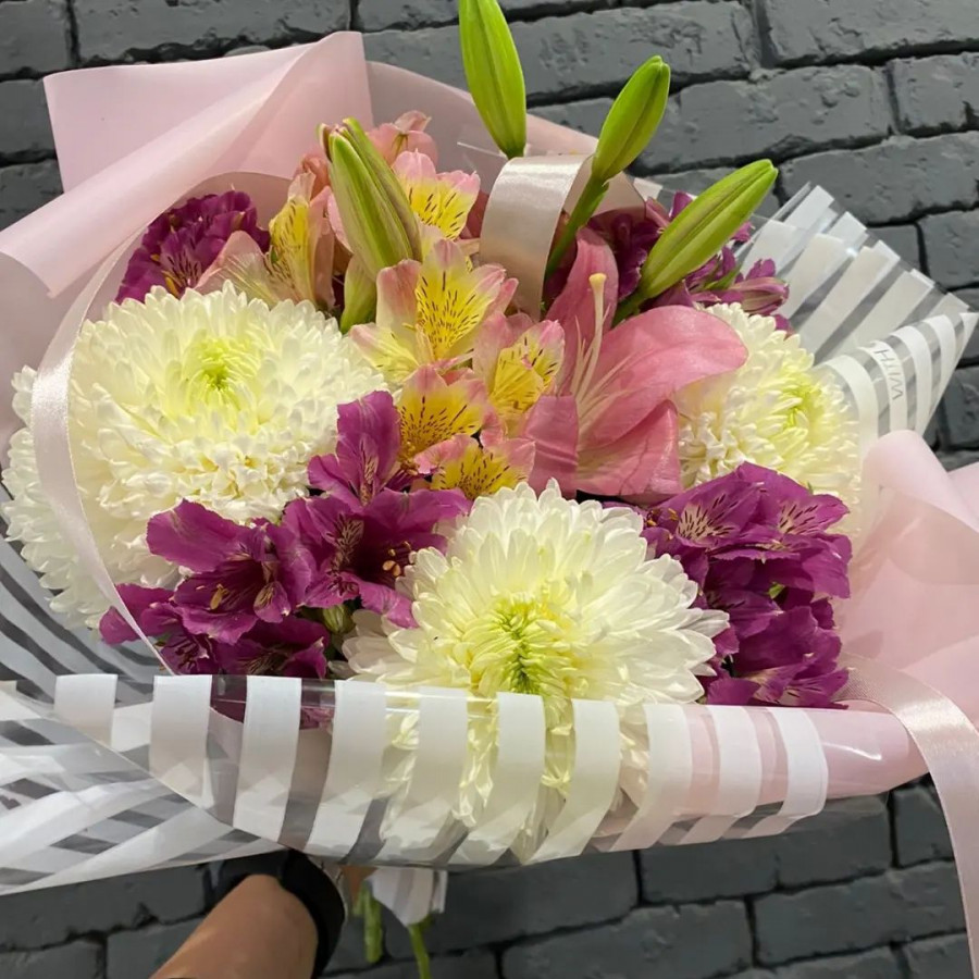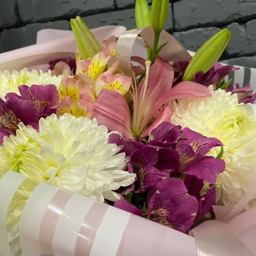 На фото букет из хризантем, альстромерии и лилии. В составе: лилия 1 шт, альстромерия 5 шт, хризантема одноголовая 3 шт, крафт-бумага 1 шт, атласная лента 1 шт, . Все цветы свежие и ароматные, букет красиво оформлен и отлично подходит для подарка. Доступна доставка цветов или самовывоз.