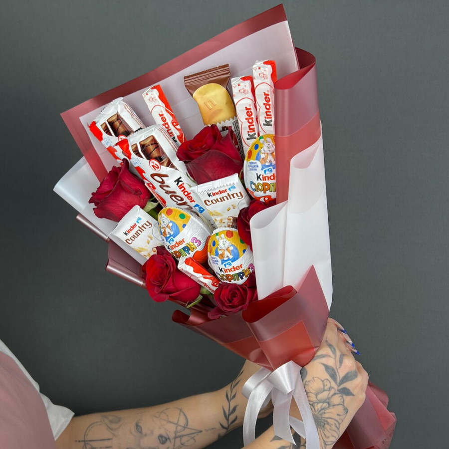 Букет из конфет KINDER и красные розы в Семикаракорске
