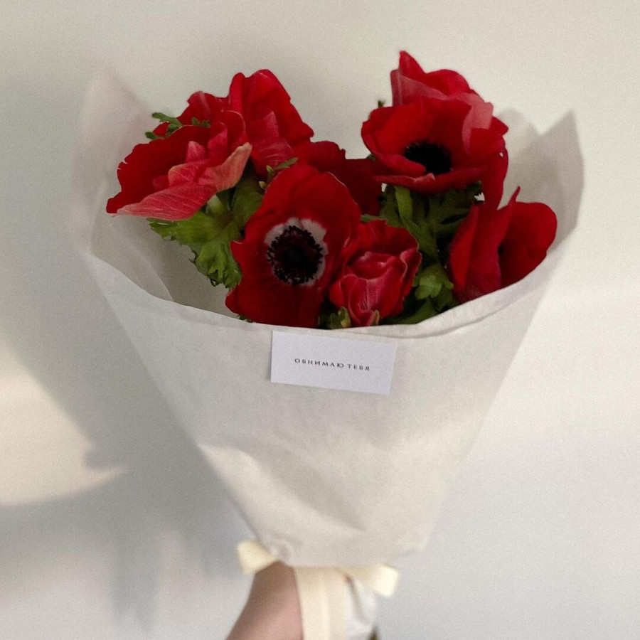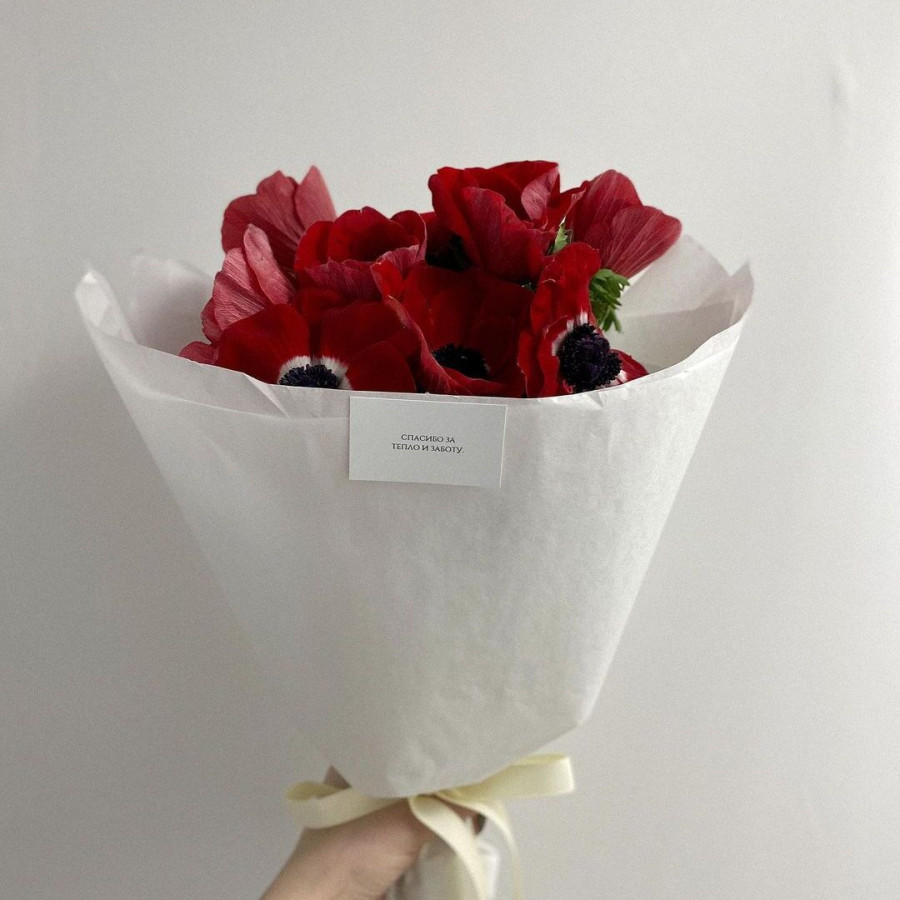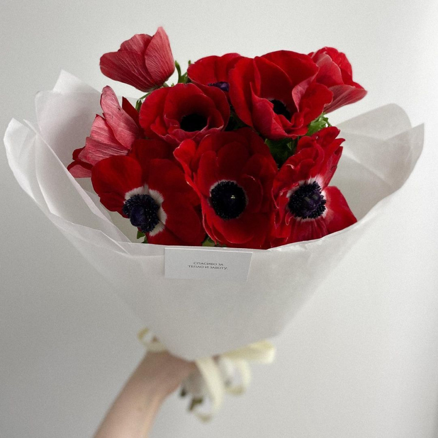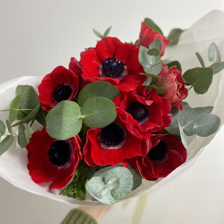 На фото букет из красных анемонов. В составе: анемон 7 шт, эвкалипт 2 шт, крафт-бумага 1 шт, атласная лента 1 шт, . Все цветы свежие и ароматные, букет красиво оформлен и отлично подходит для подарка. Доступна доставка цветов или самовывоз.