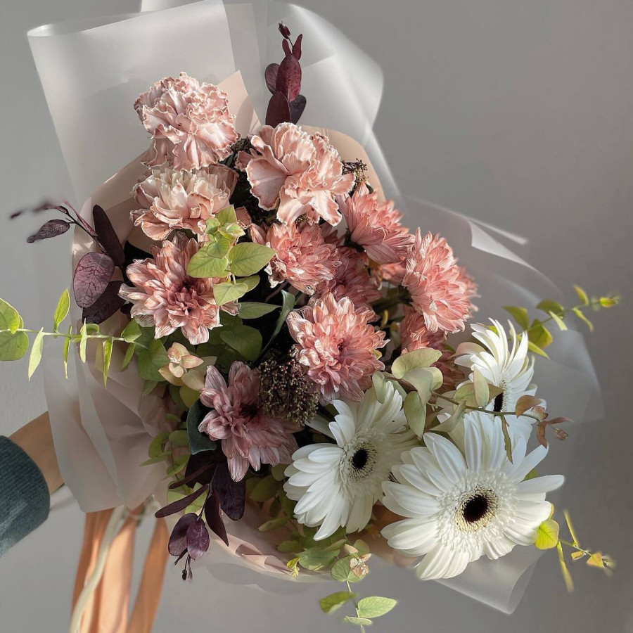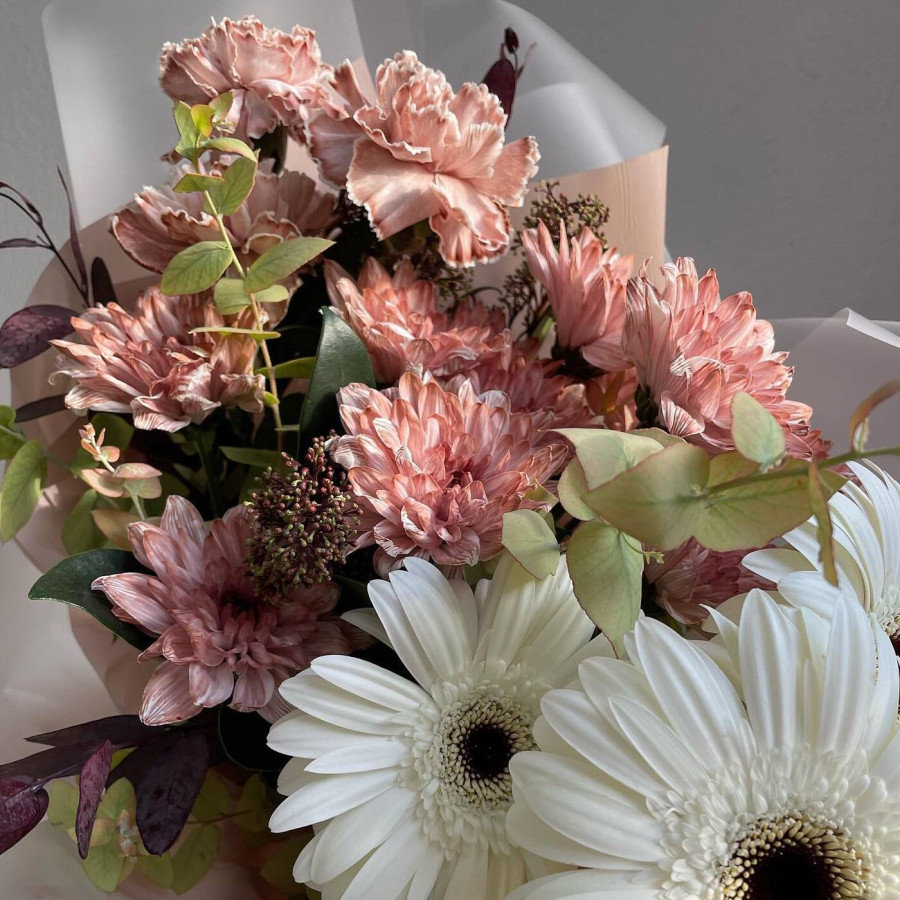 На фото букет из кустовой хризантемы и гвоздики. В составе: хризантема кустовая 4 шт, гвоздика 3 шт, гербера 3 шт, скиммия 1 шт, эвкалипт 1 шт, крафт-бумага 1 шт, . Все цветы свежие и ароматные, букет красиво оформлен и отлично подходит для подарка. Доступна доставка цветов или самовывоз.