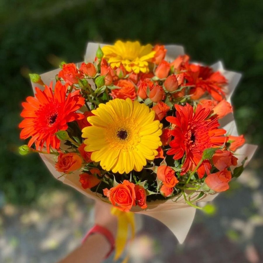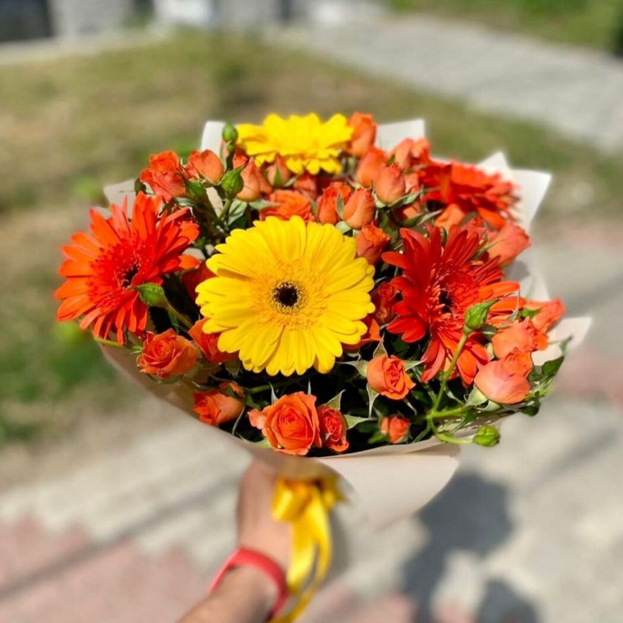 На фото букет из кустовых роз и гербер. В составе: гербера 5 шт, кустовая роза 4 шт, крафт-бумага 1 шт, атласная лента 1 шт, . Все цветы свежие и ароматные, букет красиво оформлен и отлично подходит для подарка. Доступна доставка цветов или самовывоз.
