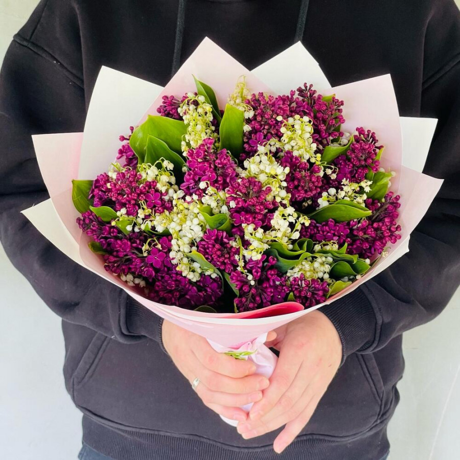На фото букет из ландышей и сирени. В составе: сирень 7 шт, ландыш 5 шт, дизайнерская упаковка 1 шт, атласная лента 1 шт, . Все цветы свежие и ароматные, букет красиво оформлен и отлично подходит для подарка. Доступна доставка цветов или самовывоз.