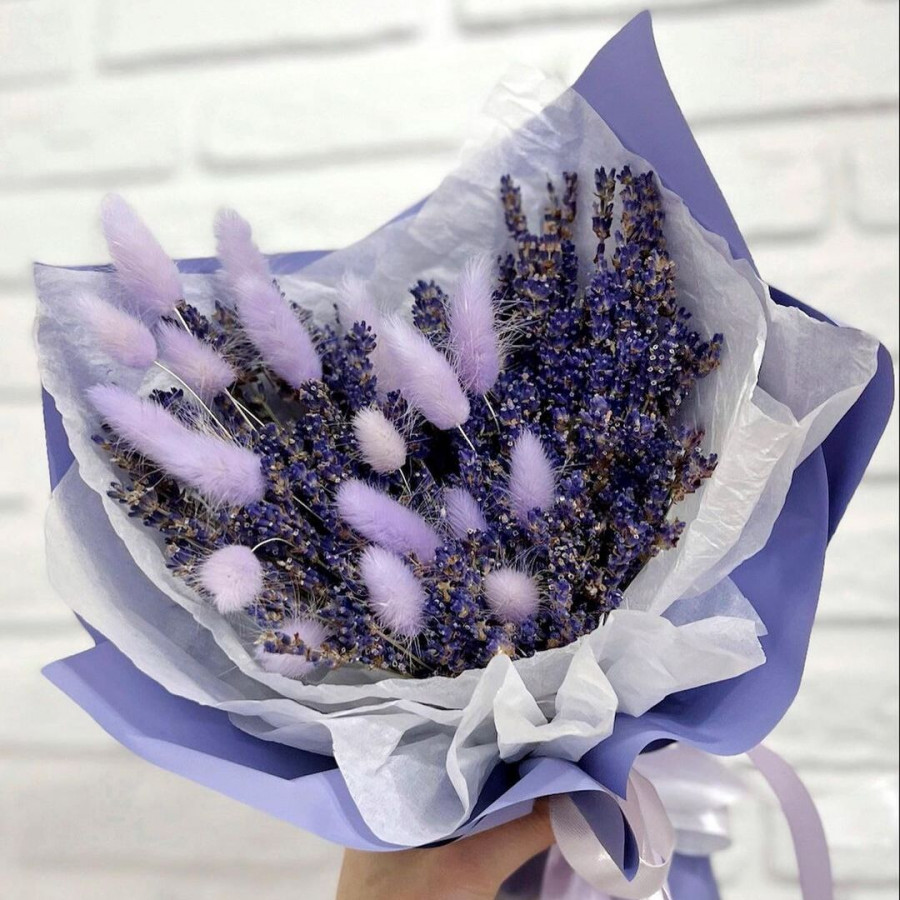 На фото букет из лаванды и лагуруса. В составе: лаванда 5 шт, лагарус 4 шт, колосья 2 шт, крафт-бумага 1 шт, вибирнум 1 шт, . Все цветы свежие и ароматные, букет красиво оформлен и отлично подходит для подарка. Доступна доставка цветов или самовывоз.