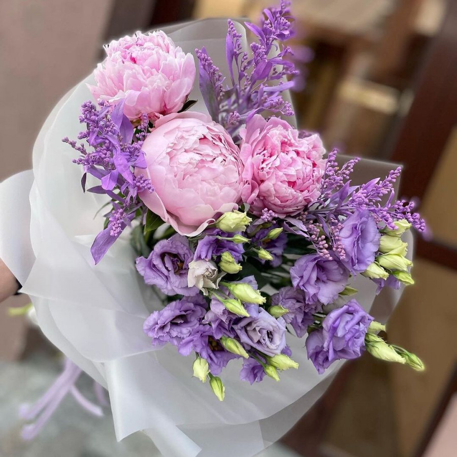 На фото букет из пионов и лаванды. В составе: пион 3 шт, лаванда 2 шт, эустома (лизиантус) 2 шт, крафт-бумага 1 шт, . Все цветы свежие и ароматные, букет красиво оформлен и отлично подходит для подарка. Доступна доставка цветов или самовывоз.