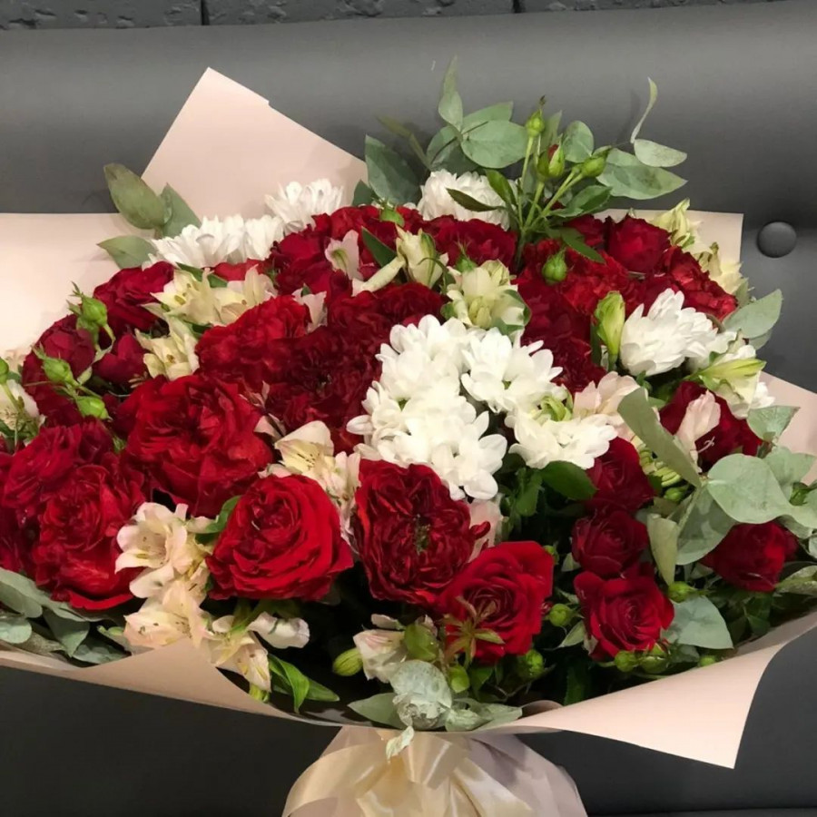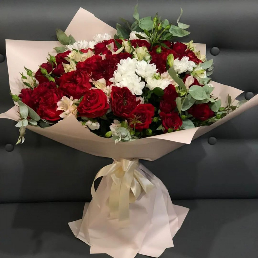 На фото букет из пионовидных роз, альстромерии и хризантем. В составе: кустовая пионовидная роза 9 шт, хризантема кустовая 5 шт, альстромерия 3 шт, гиперикум 2 шт, эвкалипт 3 шт, крафт-бумага 1 шт, атласная лента 1 шт, . Все цветы свежие и ароматные, букет красиво оформлен и отлично подходит для подарка. Доступна доставка цветов или самовывоз.
