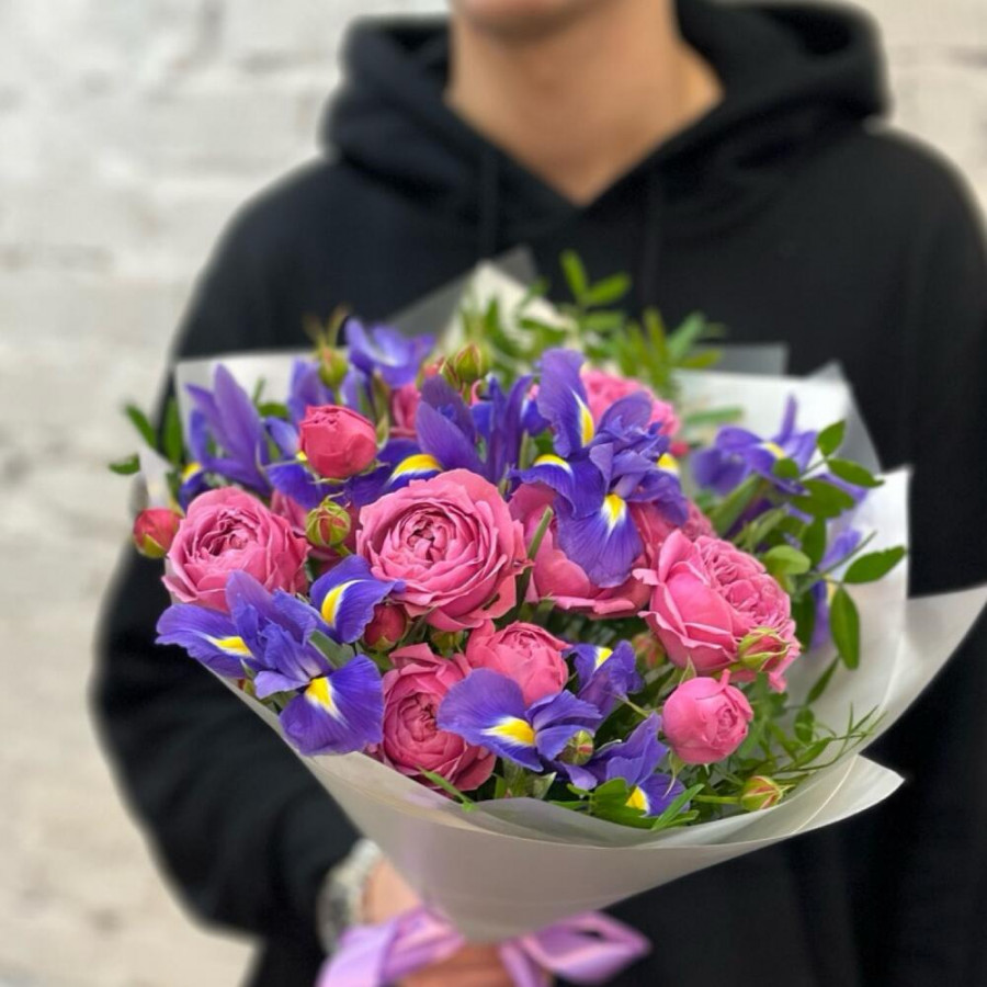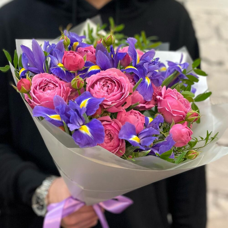 На фото букет из розовых пионовидных роз и синих ирисов. В составе: кустовая пионовидная роза 3 шт, ирис 7 шт, писташ 5 шт, дизайнерская упаковка 1 шт, атласная лента 1 шт, . Все цветы свежие и ароматные, букет красиво оформлен и отлично подходит для подарка. Доступна доставка цветов или самовывоз.